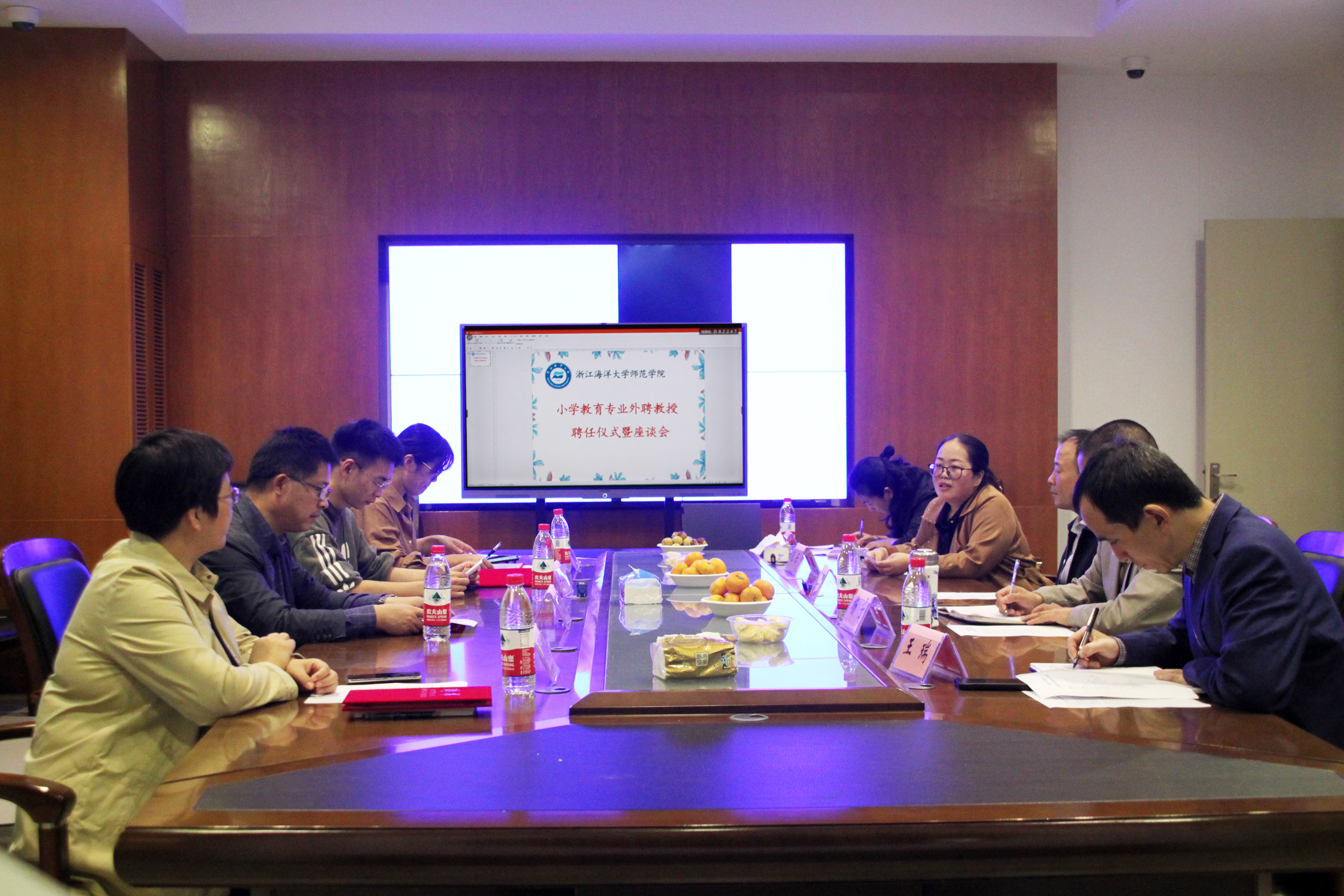 仪式开始前,孔云老师简单介绍了与会人员,并代表学院致欢迎辞。短暂交谈之后,学院党委书记杨宁等院领导为舟山教育学院教研员钟玲玲、舟山第一小学校长夏伟龙、舟山绿城育华〈国际〉学校小学部校长苏明杰、定海区檀枫小学校长朱彩娟等四位外聘教授颁发聘任证书并合影留念。