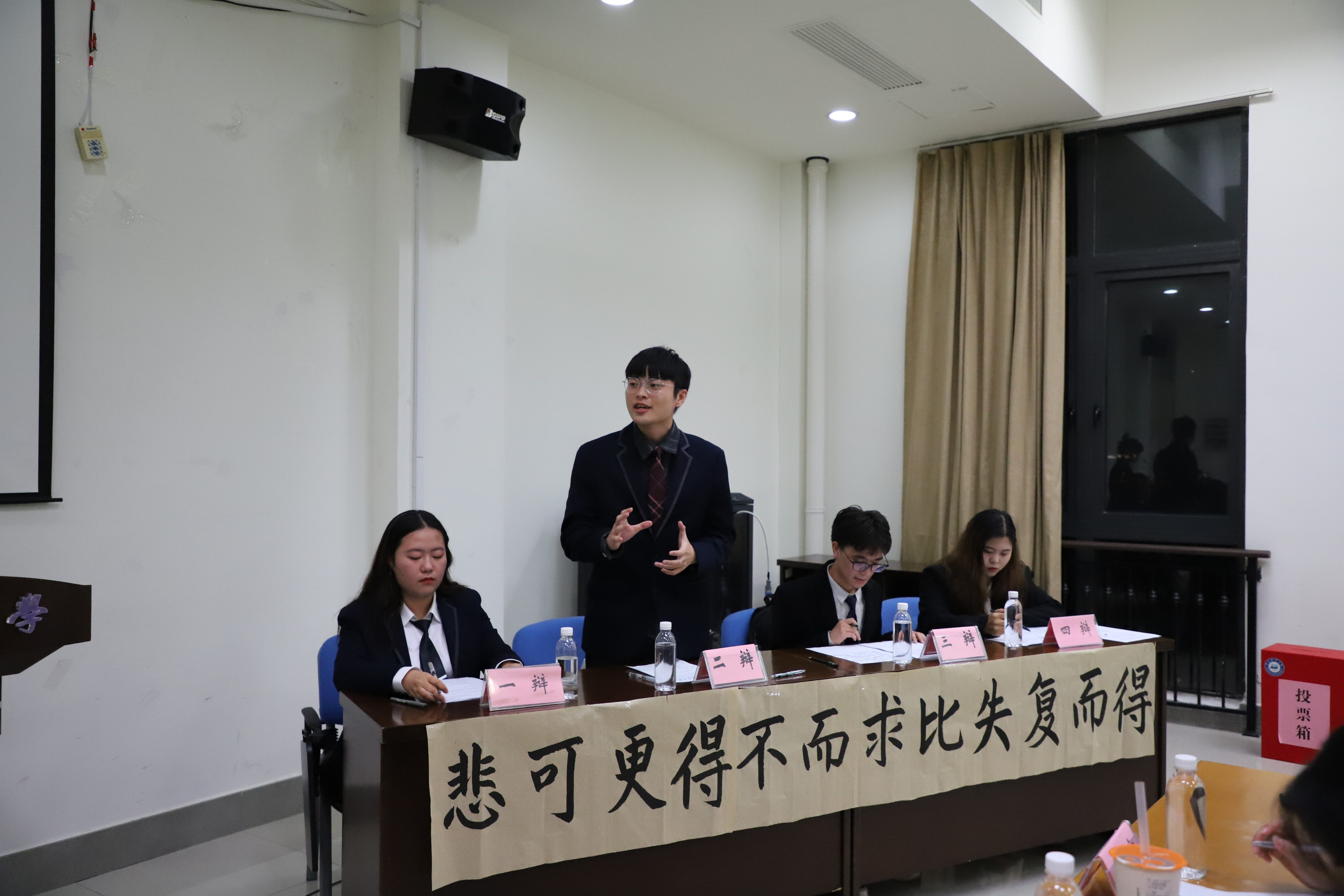 本次比赛中,双方选手就“求而不得与得而复失何者更可悲”这一辩题展开辩论。正方选手开宗明义,从“拥有与失去”入题,引出“人往往更在意拥有”从而有力立证本方观点,引起观众共鸣。反方选手当仁不让,围绕“求”与“不求”观点展开进一步立论与质问,以“得而复失心理落差更可悲”充分论证己方观点,将表演赛推向高潮,引起了新生的深刻思考。此外,新生通过“场外质询”环节提出质疑,各抒己见,现场气氛更加热烈。最后,评委总结并点评了本次辩论赛,指出了双方队员辩论中的可取之处与不足之处,鼓舞队员和新生继续学习与思考。