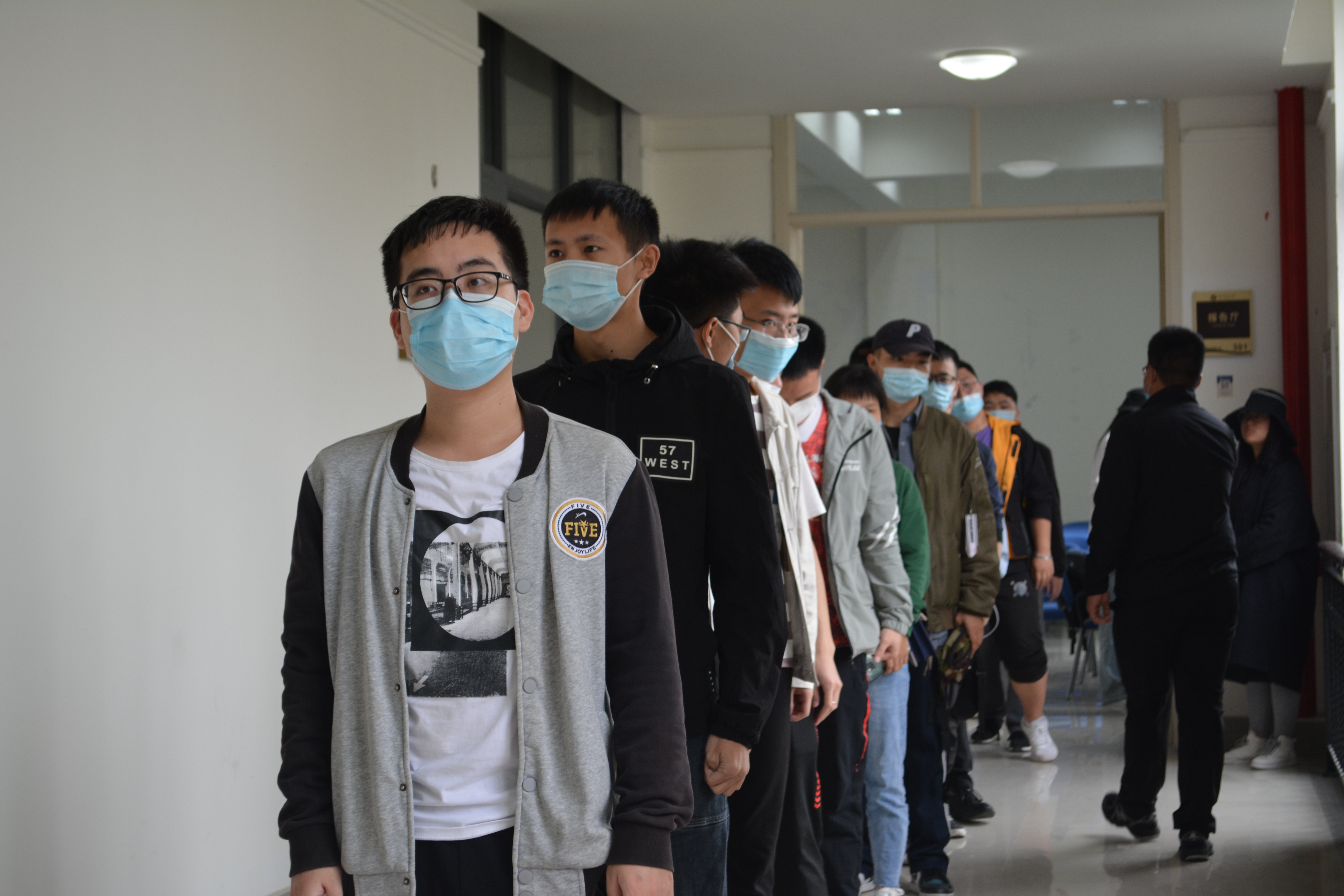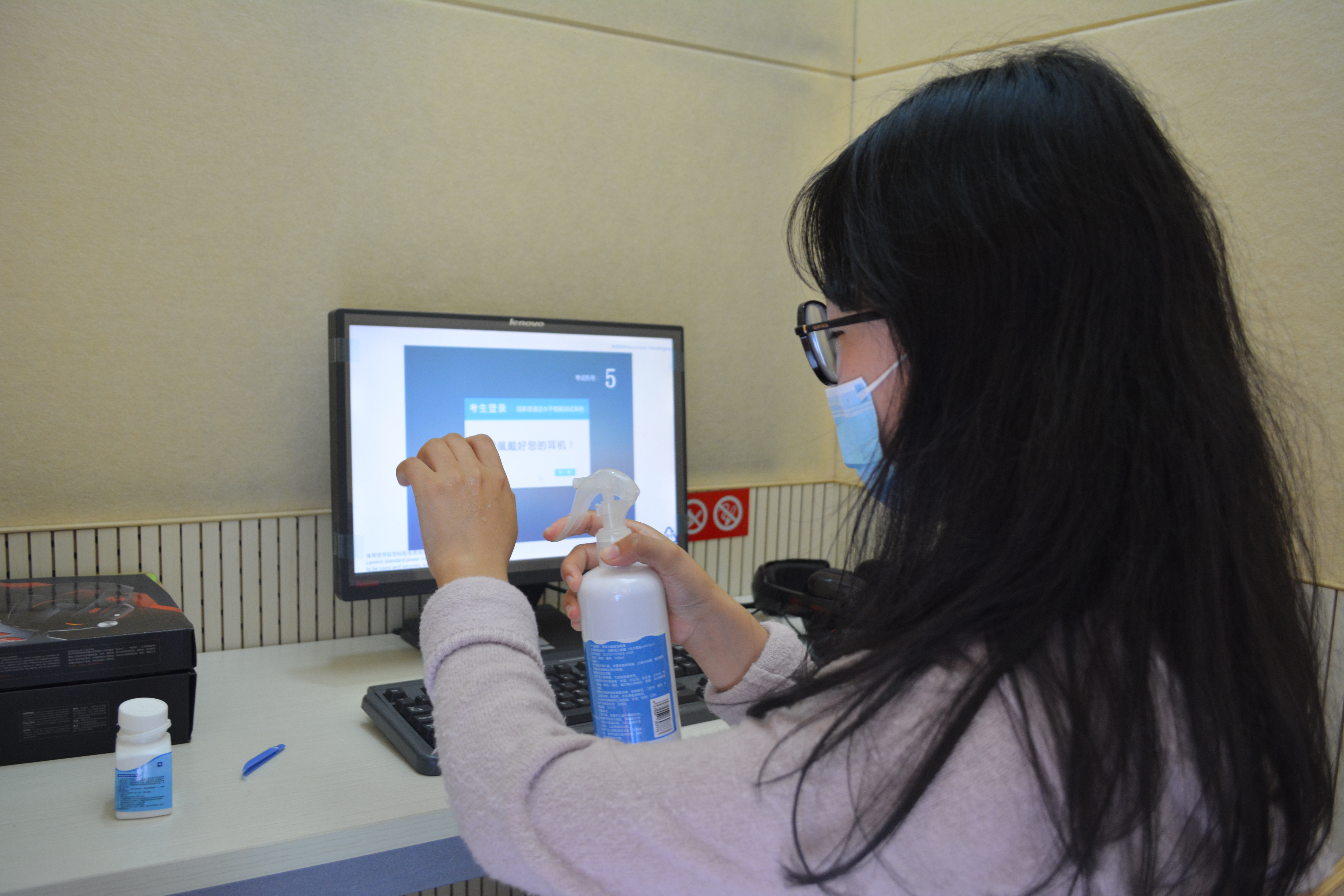测试期间,所有工作人员及考生(除拍照和考试时间)全程佩戴口罩,考生携带本人身份证,提前三十分钟到文理楼301室报到。在确认体温正常之后进入签到室进行现场签到。测试前十五分钟,考务人员带领一组考生至417室采样抽签,拍摄证书照片并领取准考证。随后考生进入418候测室,得到上机测试的通知后进入测试室。考生先对双手及考试工具(如鼠标、耳麦)进行消毒,等待考试指令发出后正式进行考试。考试完毕后,待考务老师发出考试结束指令再统一离开考场。从早上8点至下午5点,整个测试环节有条不紊地开展。