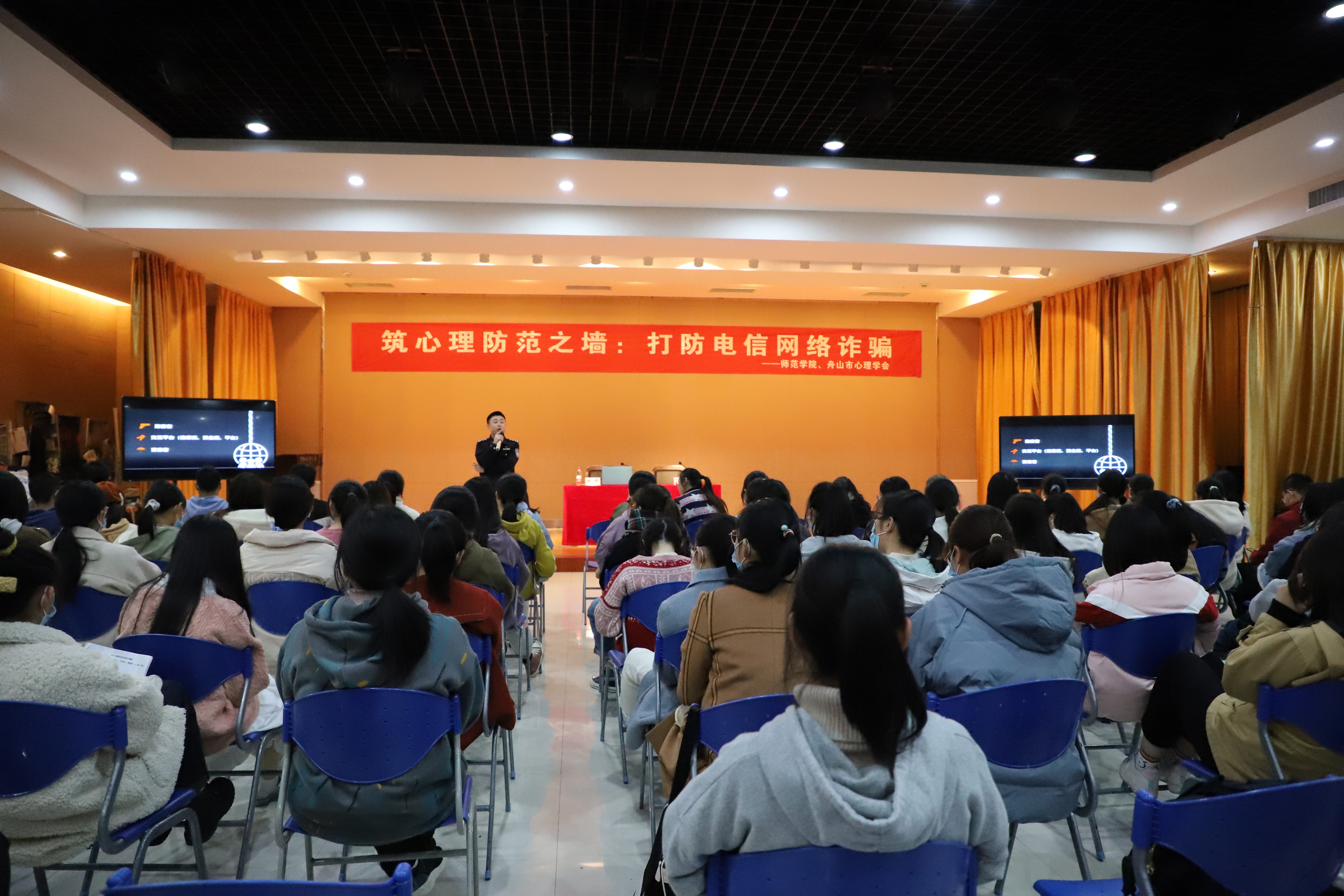 12月9日晚六点,以“筑心理防范之墙:打防电信网络诈骗”为主题的教育讲座在杨存国二号厅顺利召开。本次讲座邀请到舟山市公安局反诈中心负责打防电信网络诈骗工作的专家徐锋警官以及俞子龙警官,由徐锋警官担任主讲。我院党委副书记、纪委书记曹虹老师,辅导员张军老师,B20小教1班主任丁芳盛老师以及yl9193永利集团90名新生到场聆听。