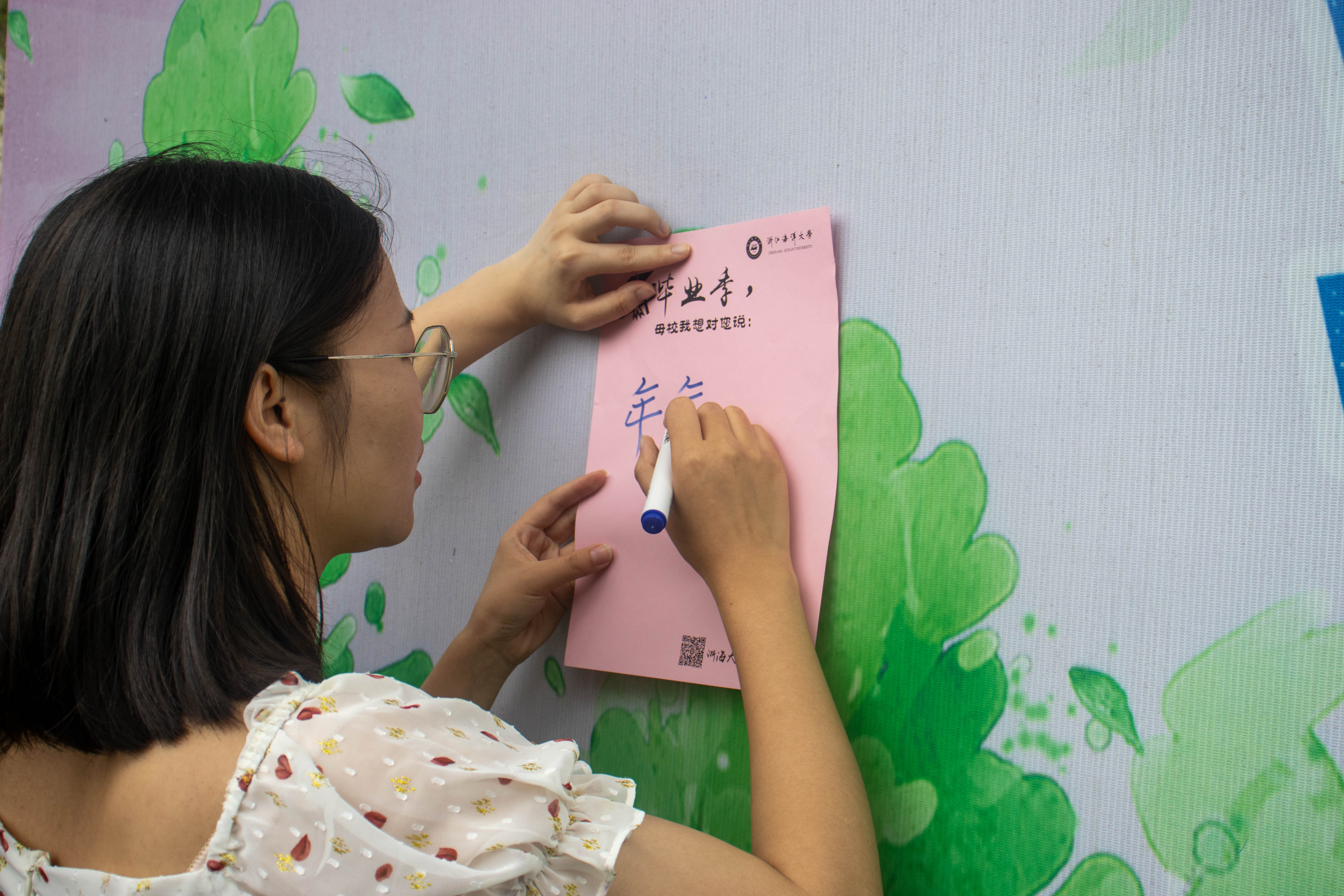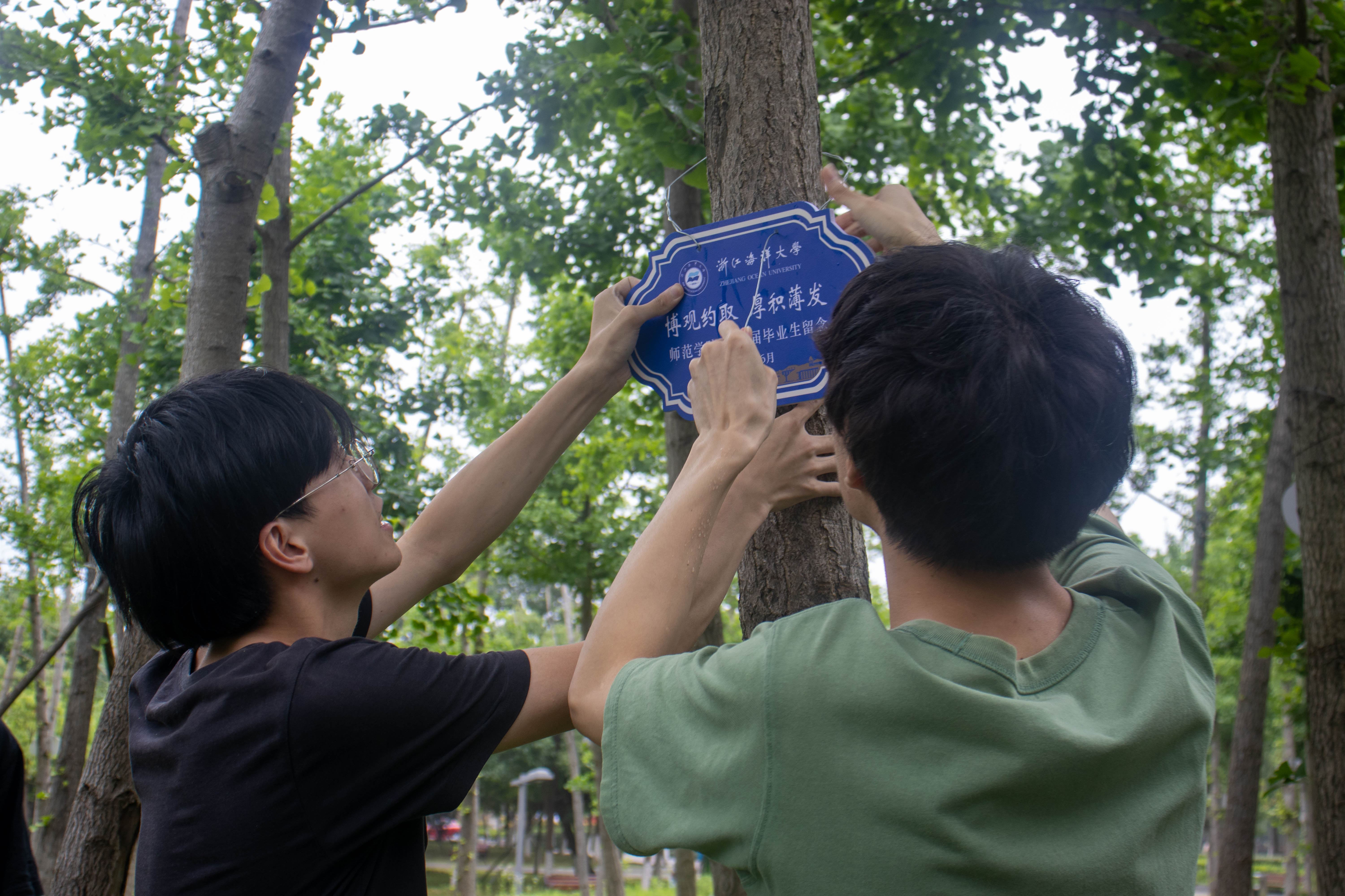 虽是夏日炎炎,却阻挡不住毕业生情系母校的步伐。活动过程中,同学们穿梭在校友林里,精心挑选树木,并一起将写有“博观约取,厚积薄发”的捐赠铭牌挂在认捐树上。一棵棵承载着岁月年轮的树木成为了他们与母校的深情的纽带,传递着他们对母校由衷的感恩。活动最后,老师与同学们在校友林中合影留念,同学们留下了对母校的牵挂,也留下了对学弟学妹的祝福。