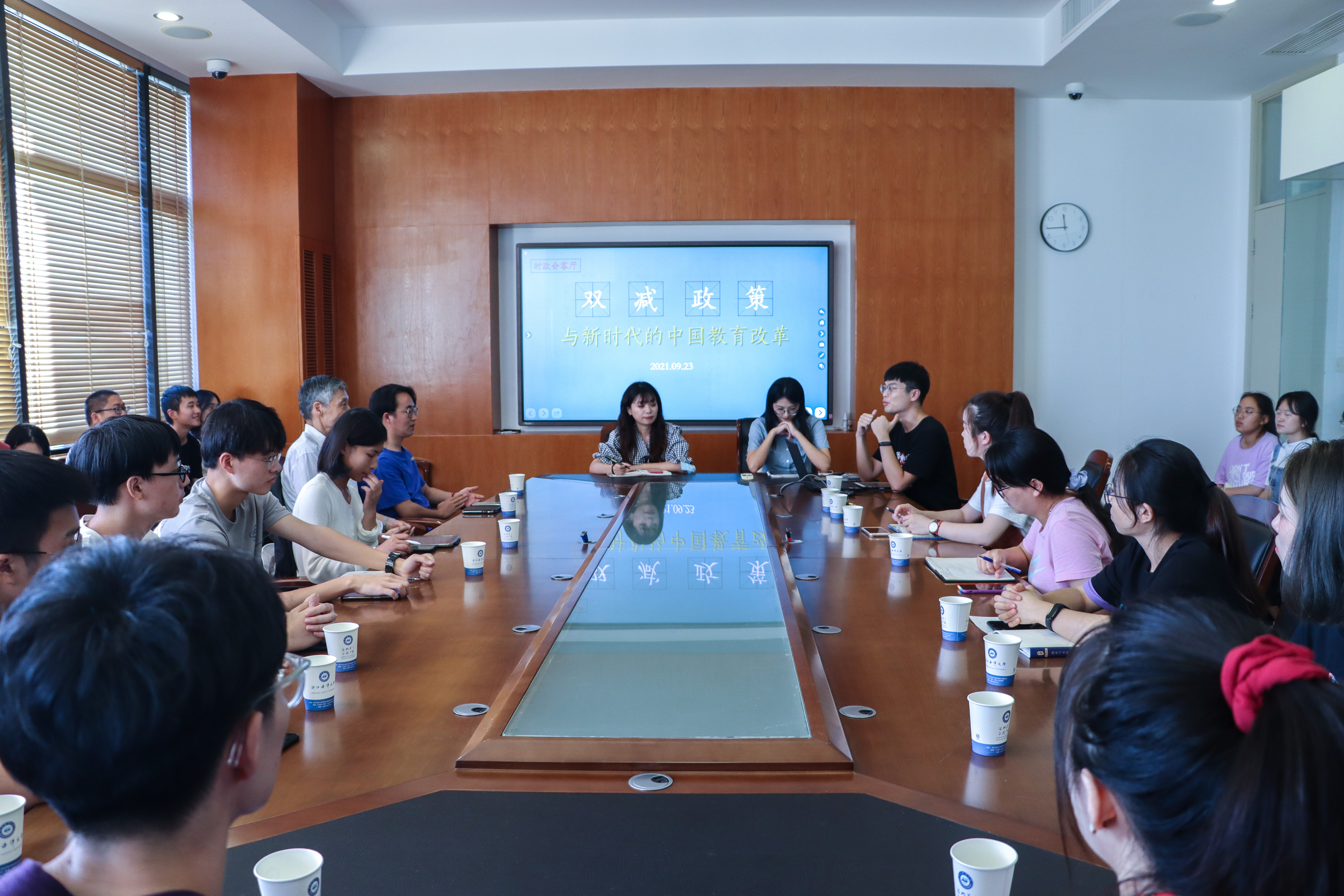 为了切实提升学校育人水平,持续规范校外培训(包括线上培训和线下培训),有效减轻义务教育阶段学生过重作业负担和校外培训负担。2021年7月24日,中共中央办公厅、国务院办公厅印发《关于进一步减轻义务教育阶段学生作业负担和校外培训负担的意见》(以下简称“双减”)。9月23日下午,时政会客厅——“双减”政策与新时代的中国教育活动于文理楼418顺利开展。