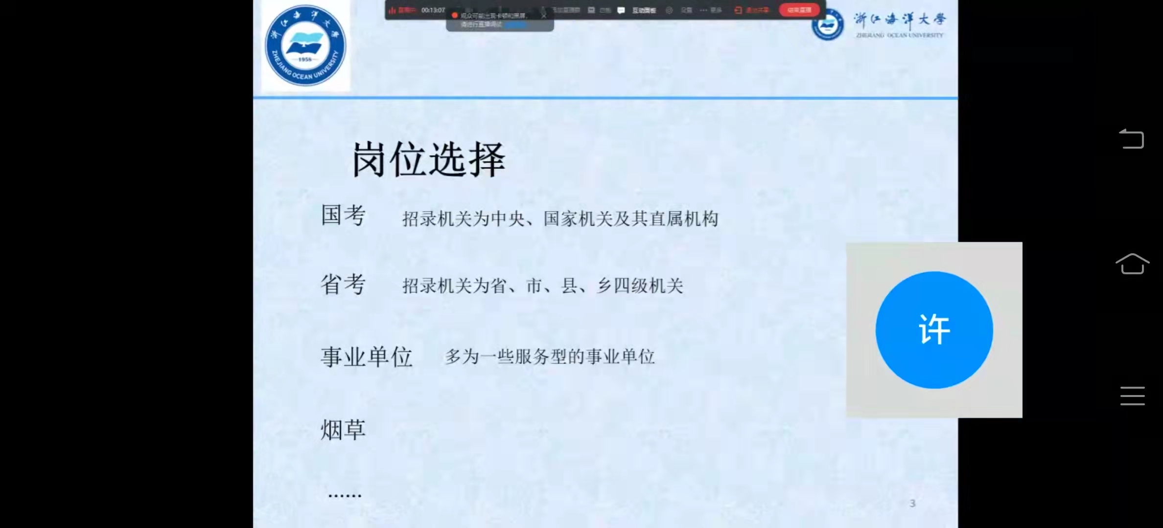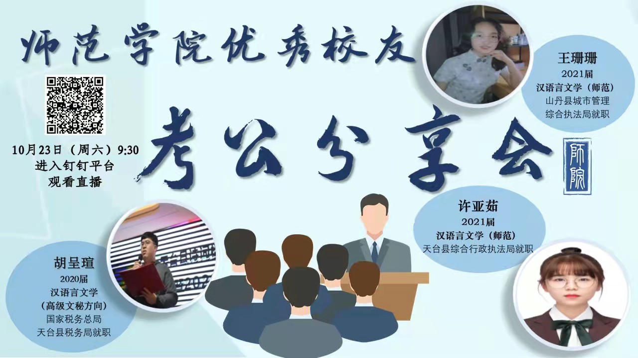 为帮助同学们汲取考公经验,了解考公信息,10月23日上午九点半,yl9193永利集团考公分享会在钉钉直播平台正式顺利举行。2021届汉语言文学(师范)专业的许亚茹同学(就职于天台县综合行政执法局)和2020届汉语言文学(高级文秘方向)专业的胡呈瑄同学(就职于国家税务总局天台县税务局)分享考公经验。学工办主任傅林静老师主持会议,150余名学生参加。