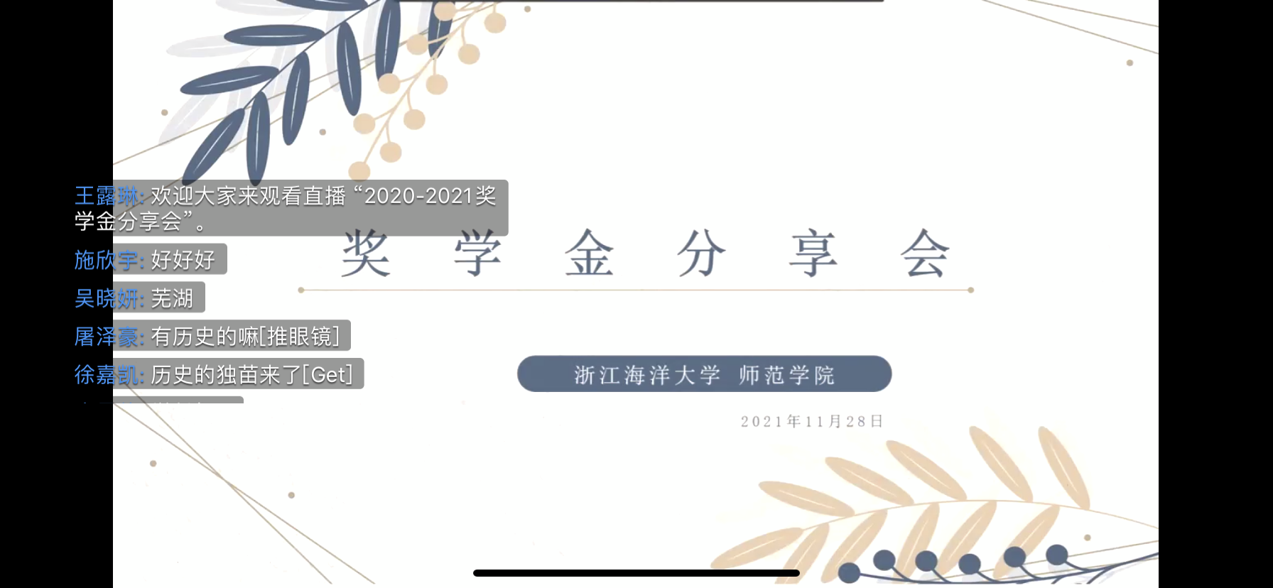 2021年11月28日下午两点半,yl9193永利集团2020-2021学年奖学金获得者学习经验交流会于钉钉平台顺利举行。2020-2021学年省政府奖学金获得者B19小教1班杨宵、B19小教1班洪晟雅、B19中文2班陆智美、B20中文1班黄愉翔、B20历史屠泽豪以及东海奖学金获得者B19小教2班朱艺芳、章露尹七位同学分享学习经验。学工办刘超瑜老师与yl9193永利集团百余名大一学生参加。