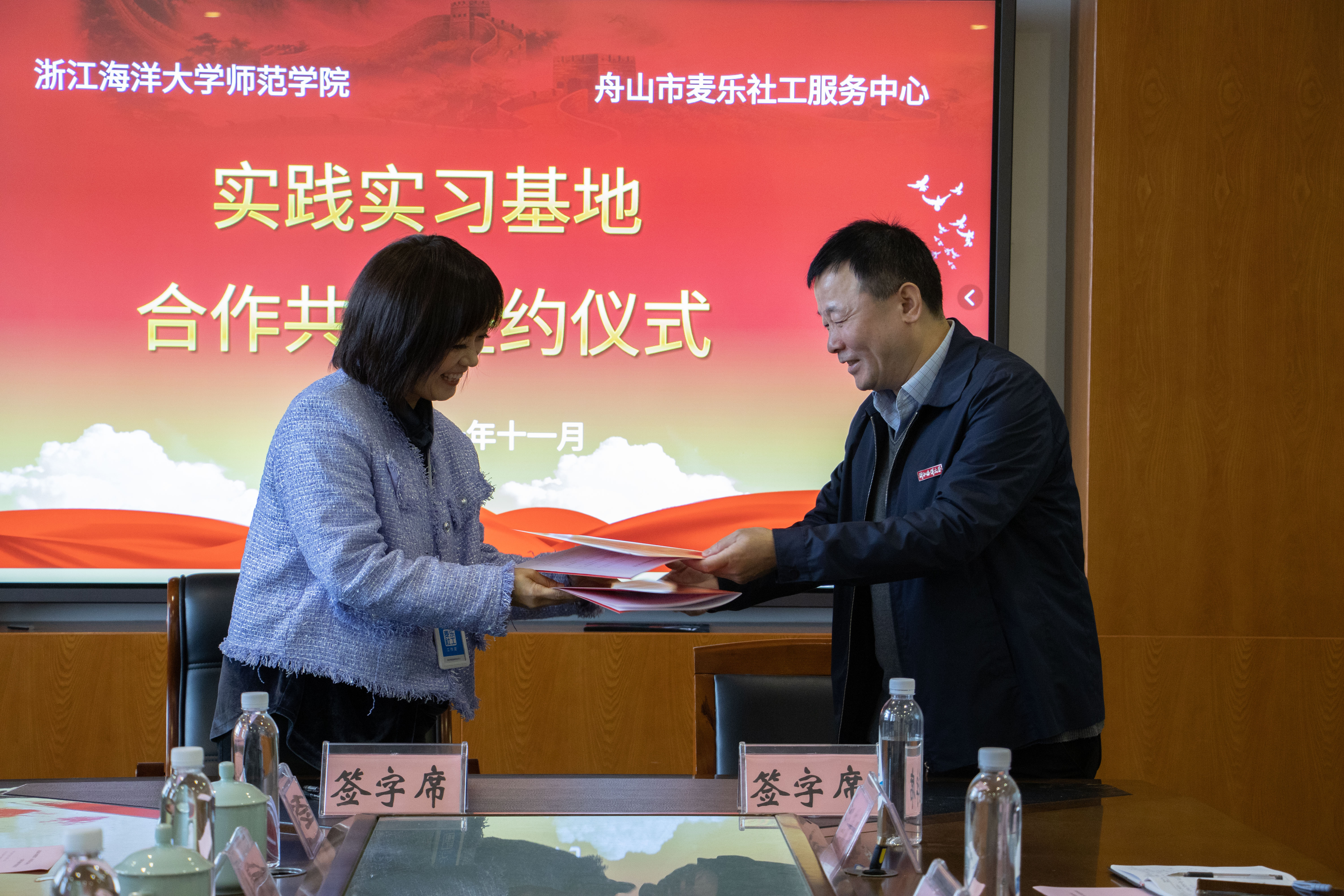 最后,yl9193永利集团院长韩伟表教授与舟山市麦乐社工服务中心理事长林静共同签署实践实习基地合作共建协议,双方代表合影留念。