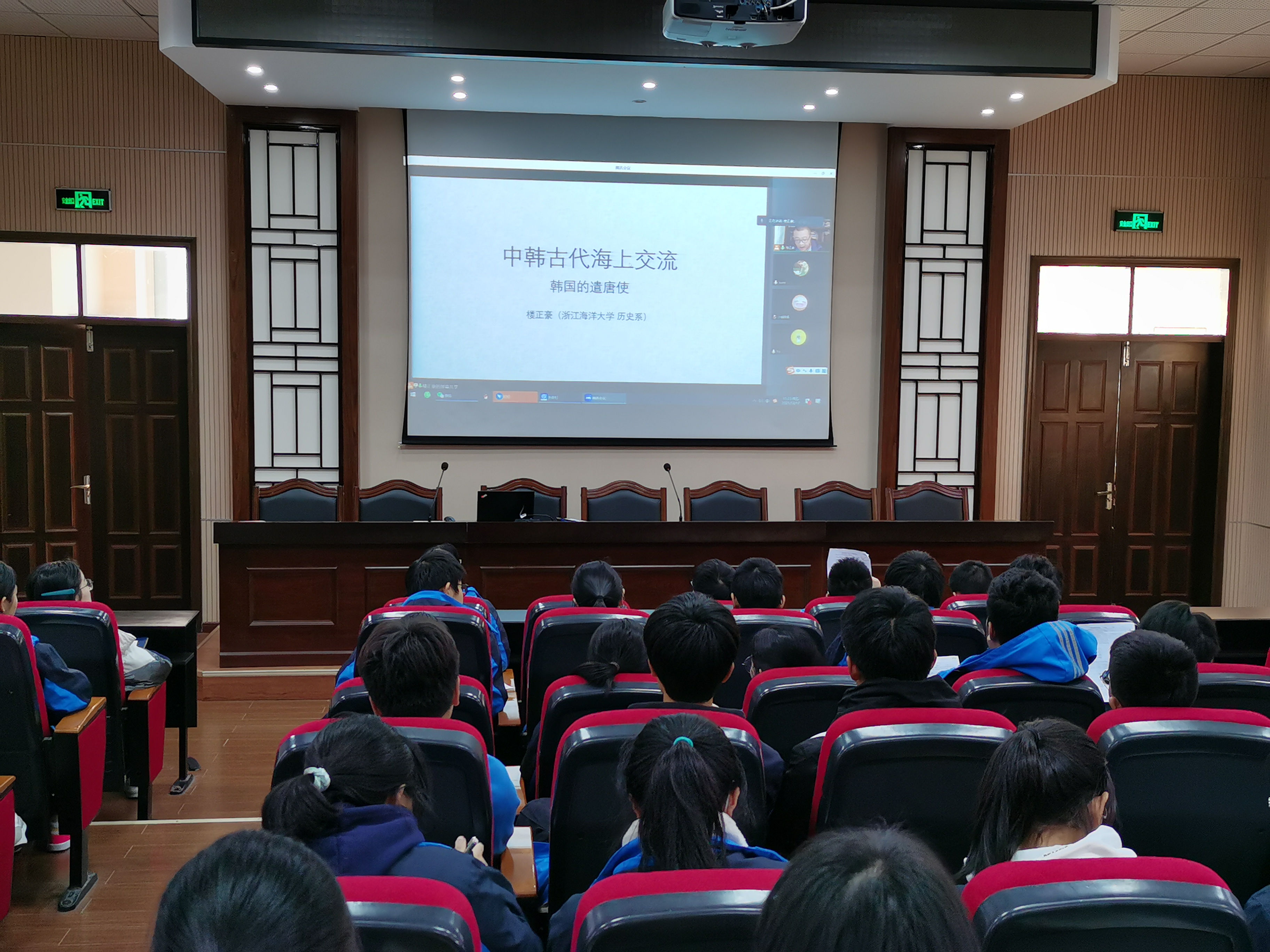 楼正豪老师以《中韩古代海上交流:韩国的遣唐使》为主题,结合朝鲜半岛的历史与基本文献,系统地讲解了韩国遣唐使的基本情况。楼老师提到,遣唐使的由来最早可追溯到日本,并简单描述了日本遣唐使朝贡的相关文物及其历史。同时,楼老师通过列举阿倍仲麻吕、井真成、崔致远、金日晟等日韩遣唐使的事例,指出日韩遣唐使是促进中日韩交流更为全面、深入的关键人物,对推动日韩社会的发展和促进中日韩友好交流做出了巨大贡献。楼老师强调,遣唐使汲取了盛唐文化,中国的许多律令制度、文化艺术、科学技术以及风俗习惯等,通过他们传入日韩,对日韩的社会发展产生了重大影响。在整个海洋科普公益讲堂中,楼正豪老师语言风趣幽默,讲解声情并茂,赢得了在场师生的一致好评。