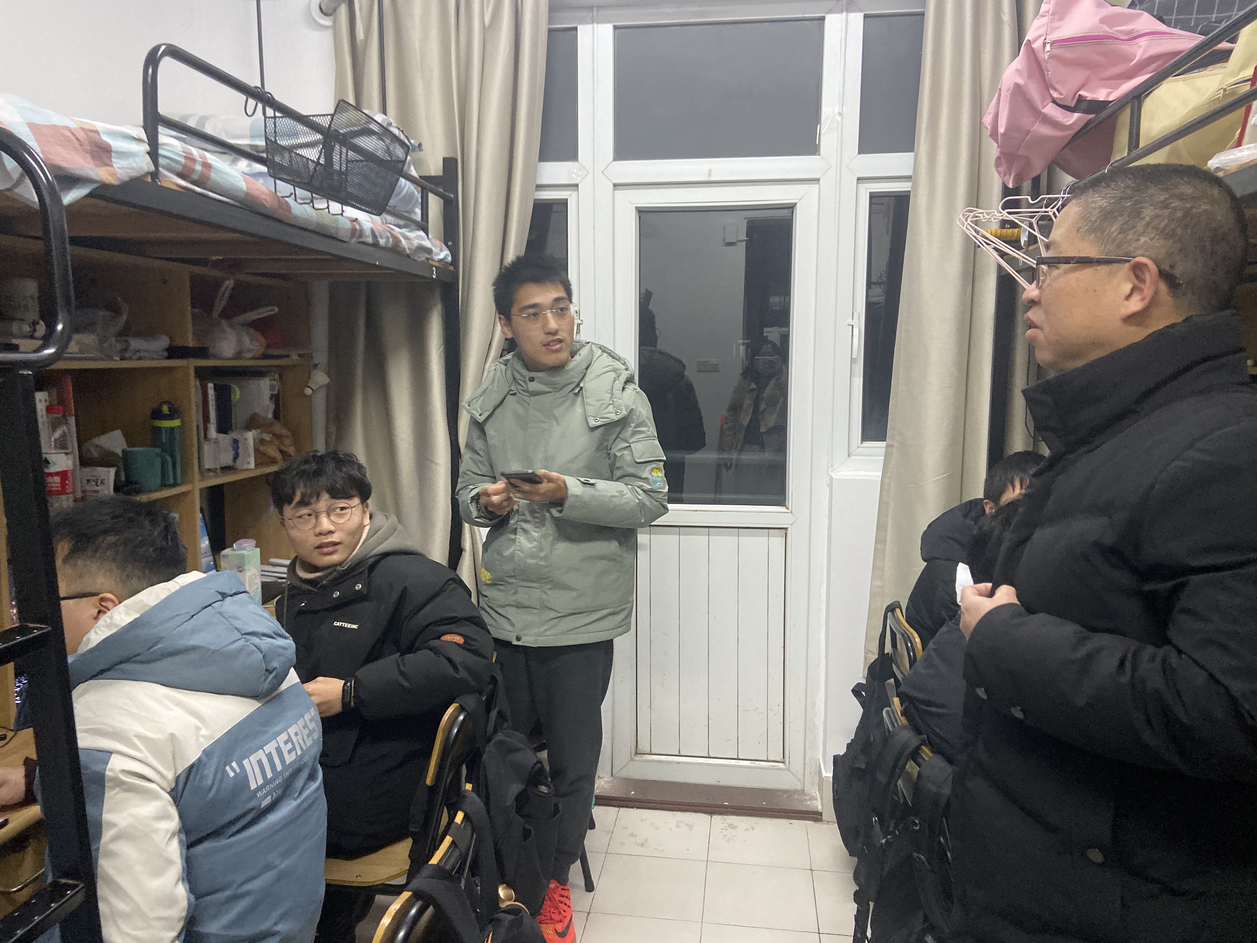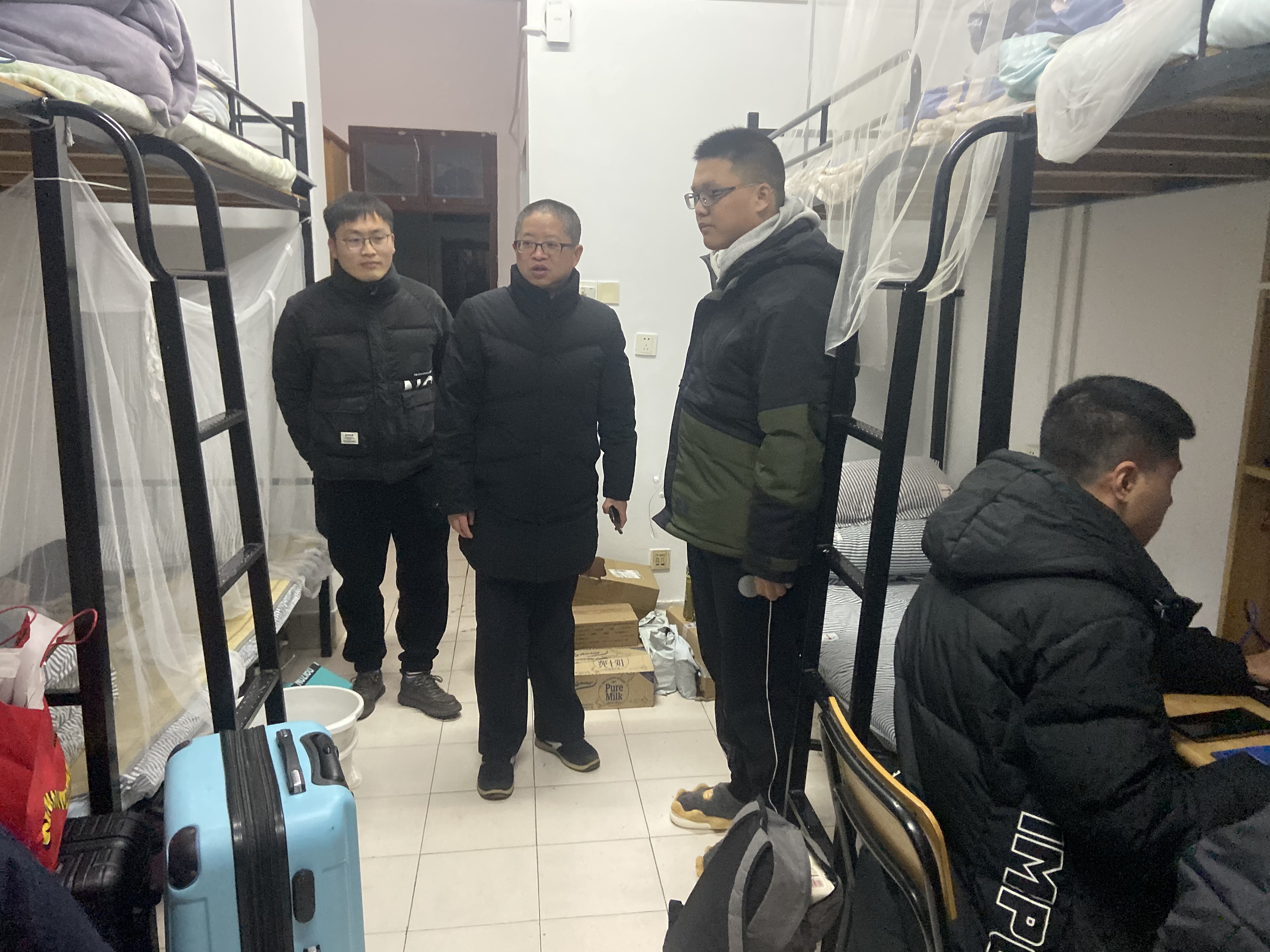 党委书记杨宁,辅导员刘超瑜、张军一行走进寝室,与学生亲切交谈。杨书记详细了解了学生寒假期间学习情况,寝室成员返校情况以及新学期的适应情况。杨书记强调,全国疫情形势依旧严峻,返校后要遵守学校疫情防控相关规定,在合理安排自身学习生活的同时主动积极配合学校和学院疫情防控措施,及时反馈生活、学习和择业中所遇到的各类问题与困难,希望返校同学的生活舒心、学习安心、社会放心。
