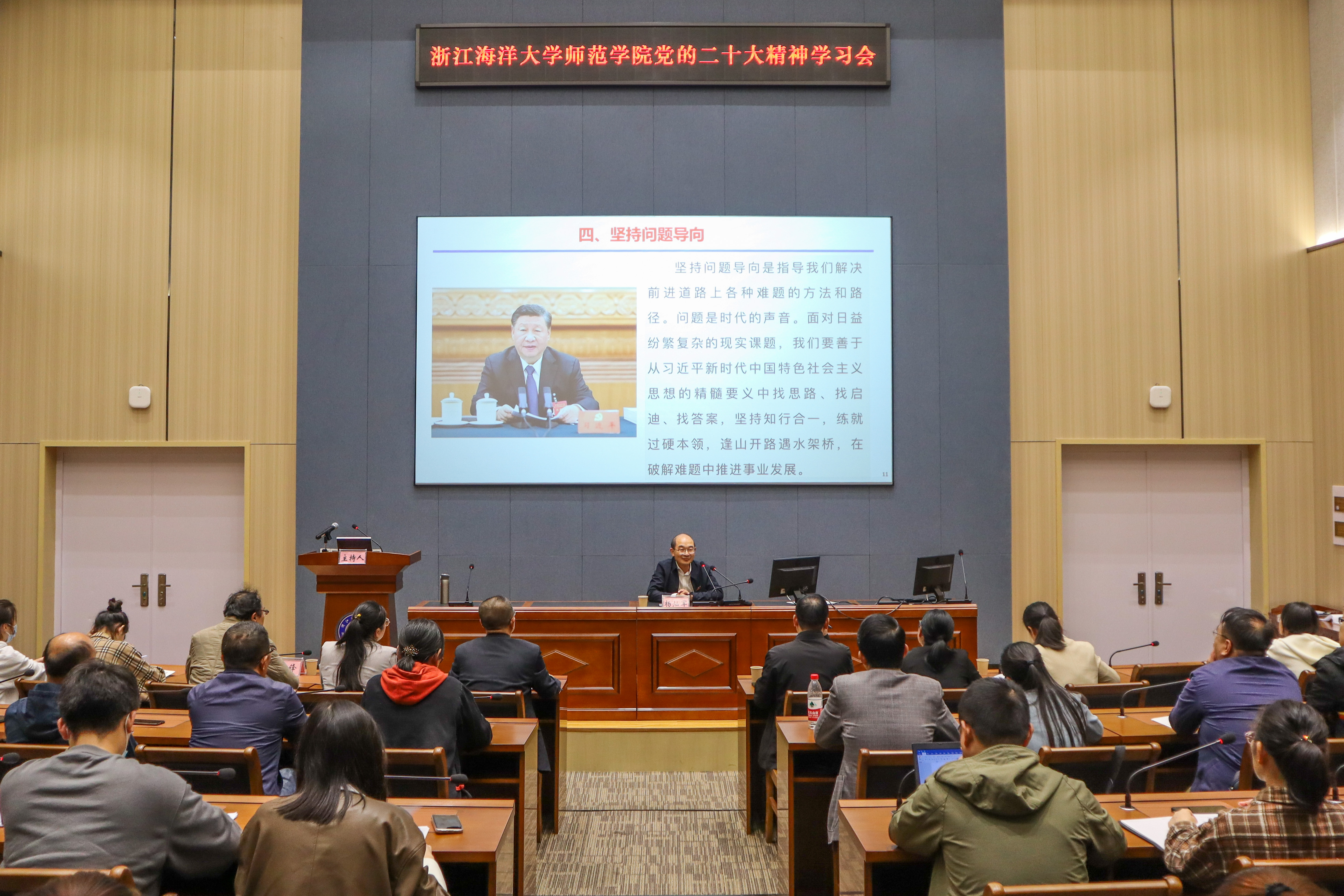 宣讲会伊始,杨灿军校长带领师生们认真学习了党的二十大精神,集中回顾了“六个坚持”的丰富内涵和精神实质,并从“坚持人民至上”的观点出发,结合习近平总书记对人民群众地位的高度评价,联系我校实际,以小见大地指出:“全体浙海大师生对美好生活的向往就是我们的奋斗目标”。