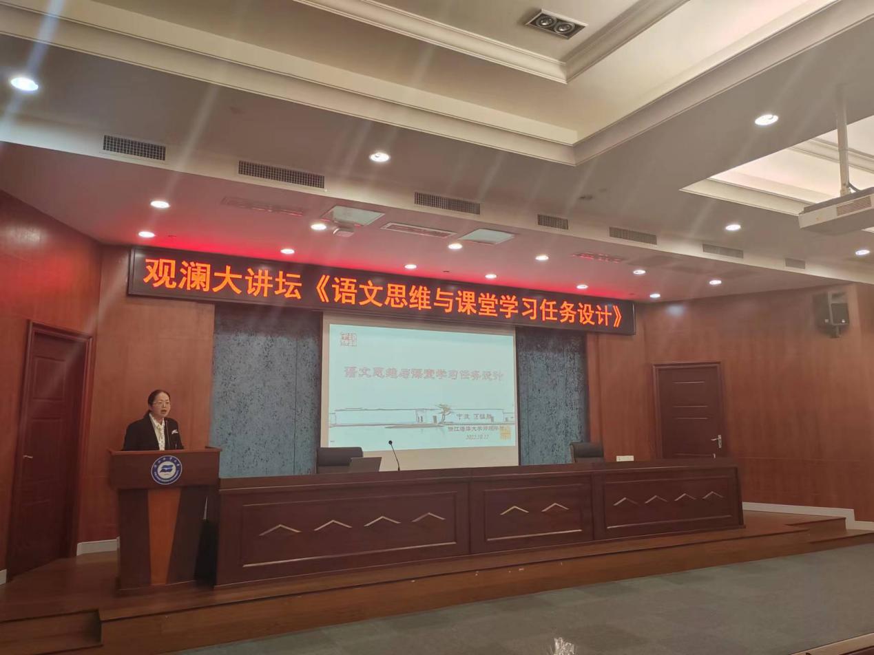 范老师以“语文思维与课堂学习任务设计”为题,从情景式教学案例切入,生动形象地阐释了语文课程中思维培养的重要性。范老师指出,要围绕2022版语文新课标中“学习任务群”的理念,设置课堂学习任务,厚植语文思维培养的意识。讲座中,范老师从言语思维、文体思维和文化思维三个角度,翔实地论述了语文思维培养的方法与路径。