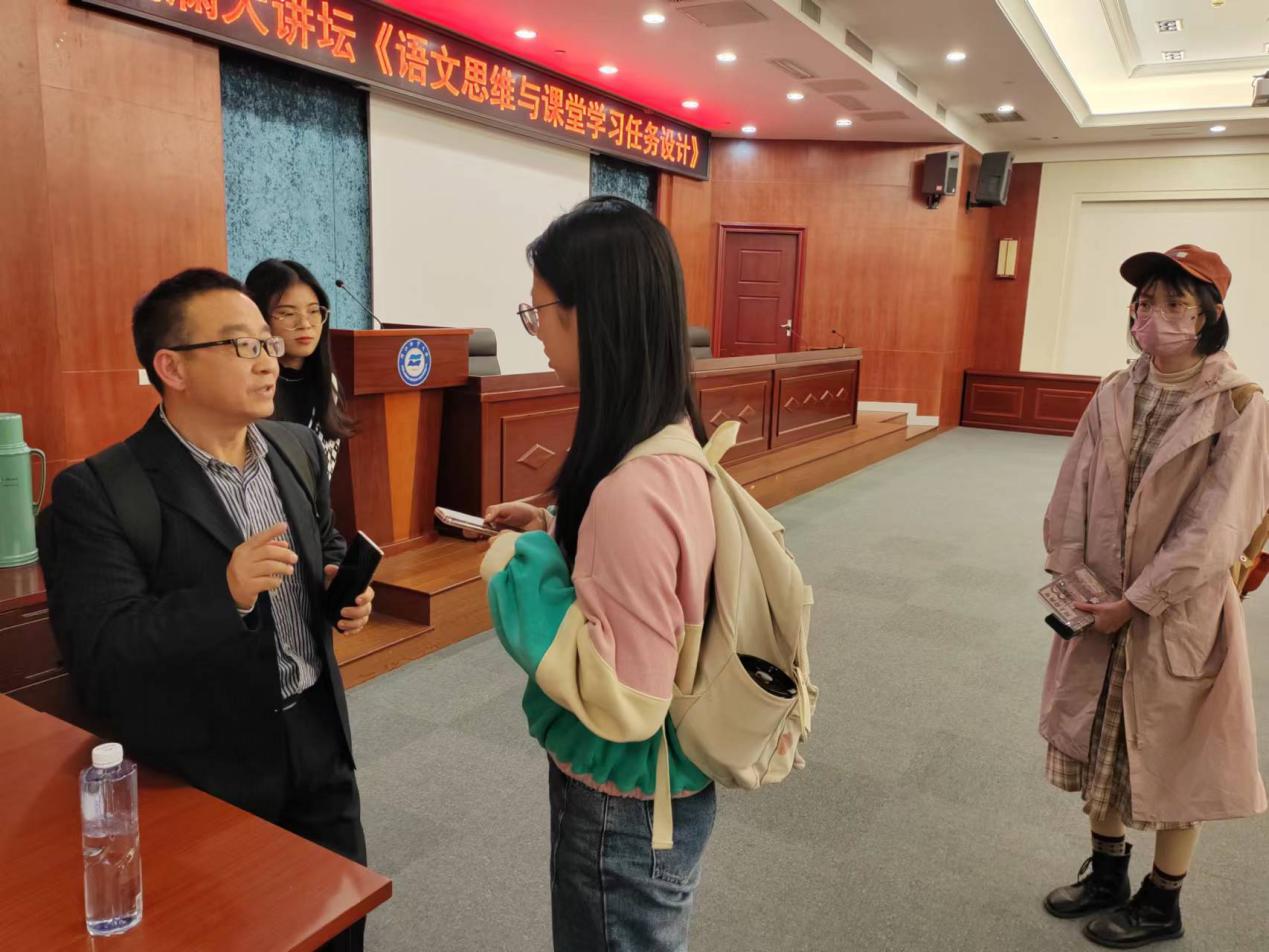范老师的讲座内容深入浅出,理论与实践相结合,尤其围绕言语思维、文体思维、文化思维等观点介绍了《昆明的雨》《散步》《怀疑与学问》《论语》《马说》《狼》等近十篇教学设计案例,既深化了师生们的教育理论认知,又丰富了教学技能知识,令大家受益匪浅。同时,范老师旁征博引、出口成章,侃侃而谈,让师生们领略到语文特级教师的教学风采,沉浸式感受到范老师课堂教学的魅力。