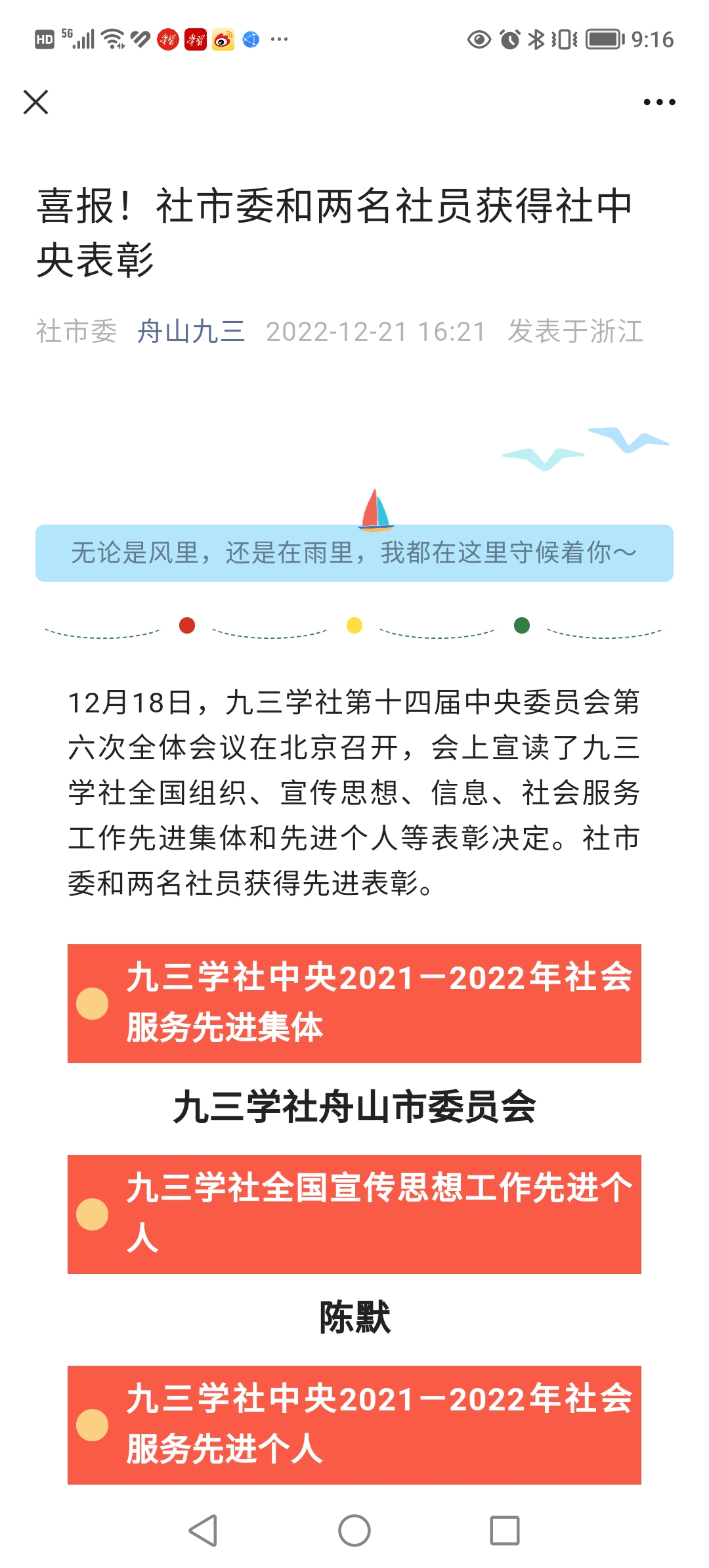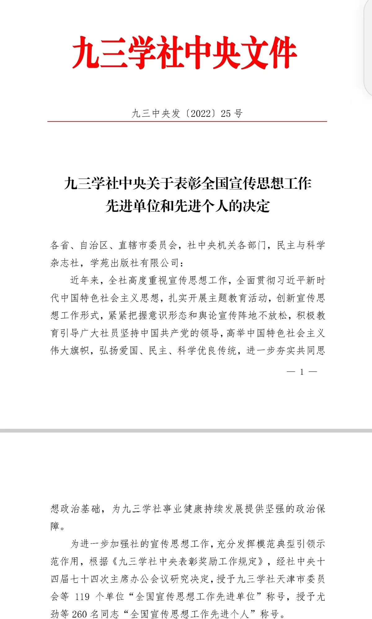 2022年12月18日,九三学社中央十四届六次全会在北京召开。会议公布了表彰2021—2022年全国宣传思想工作先进单位和先进个人的决定,yl9193永利集团陈默老师获得“全国宣传思想工作先进个人”称号。