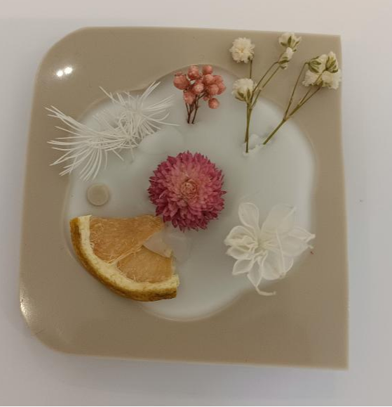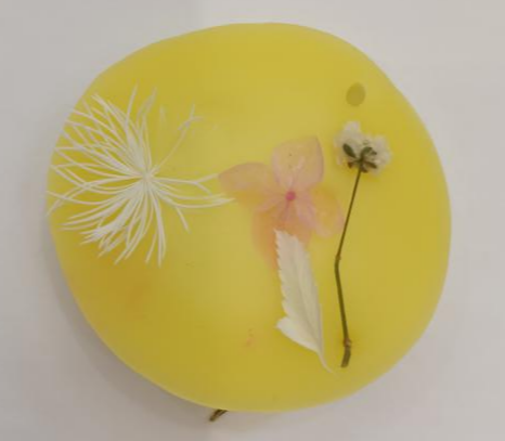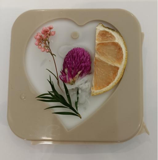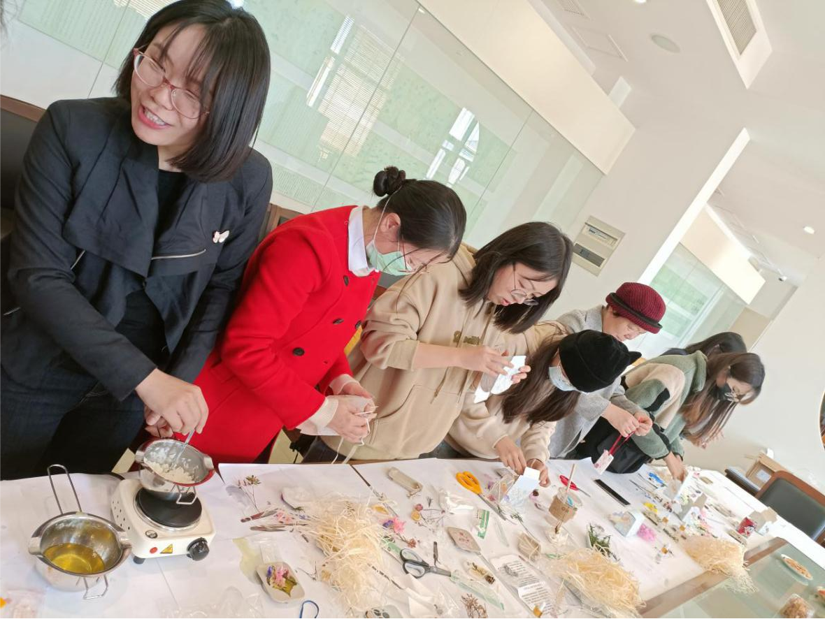 进入实操阶段,女老师们一个个跃跃欲试,她们精心挑选花材,巧妙地构思设计,将自己对美的理解与领悟融入到蜡片制作之中。只见她们小心翼翼地将蜡倒入热锅中,等待蜡块融化成液体,同时放入香精和色素。当蜡烛彻底融化为液体后,迅速倒入模具之中,静待液体重新凝固成蜡块。待透明的液体呈现半凝固状态时,点缀上干花和漂亮的装饰物,蜡块全部冷却凝固之后,精美的香薰蜡片就完成了,将其脱模固定、系上丝带,一件件芳香四溢的蜡片工艺品诞生了。