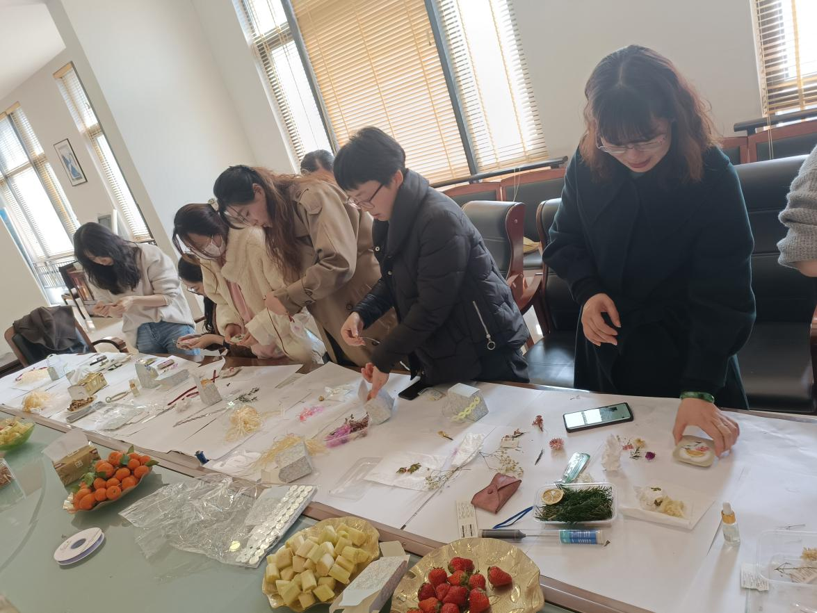 活动伊始,大家共同观看了教学视频,学习了解香薰蜡片的制作过程。随后,徐方晓和孙孟两位老师分别向大家演示了制作步骤。蜡片制作材料主要包括蜡片、花材、香氛精油和模具。由于蜡片需要融化,老师特别强调了安全问题。