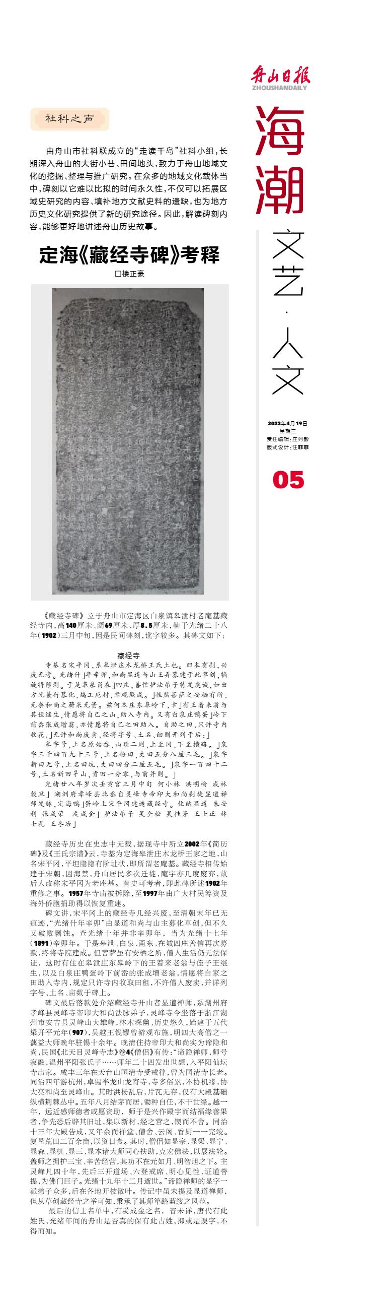 4月19日,《舟山日报》第05版“海潮文艺·人文”刊发学院历史系楼正豪副教授的论文《定海<藏经寺碑>考释》。