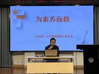 最后,舟山一小教育集团校长夏伟龙做总结发言,主题是“为素养而教”。夏校长指出,教育只有一个主题,就是五彩斑斓的生活,要学习有价值的知识。教学方面,夏校长结合自身教学经历与教育学家的经典思想,强调教师要从教专家结论转向教专家思维,有的放矢地进行教学,也就是要从教教材转变为用教材教。此外,夏校长还点明了大单元设计及任务驱动模式在语文教学中的实用性与可操作性,令全体实习生受益匪浅。