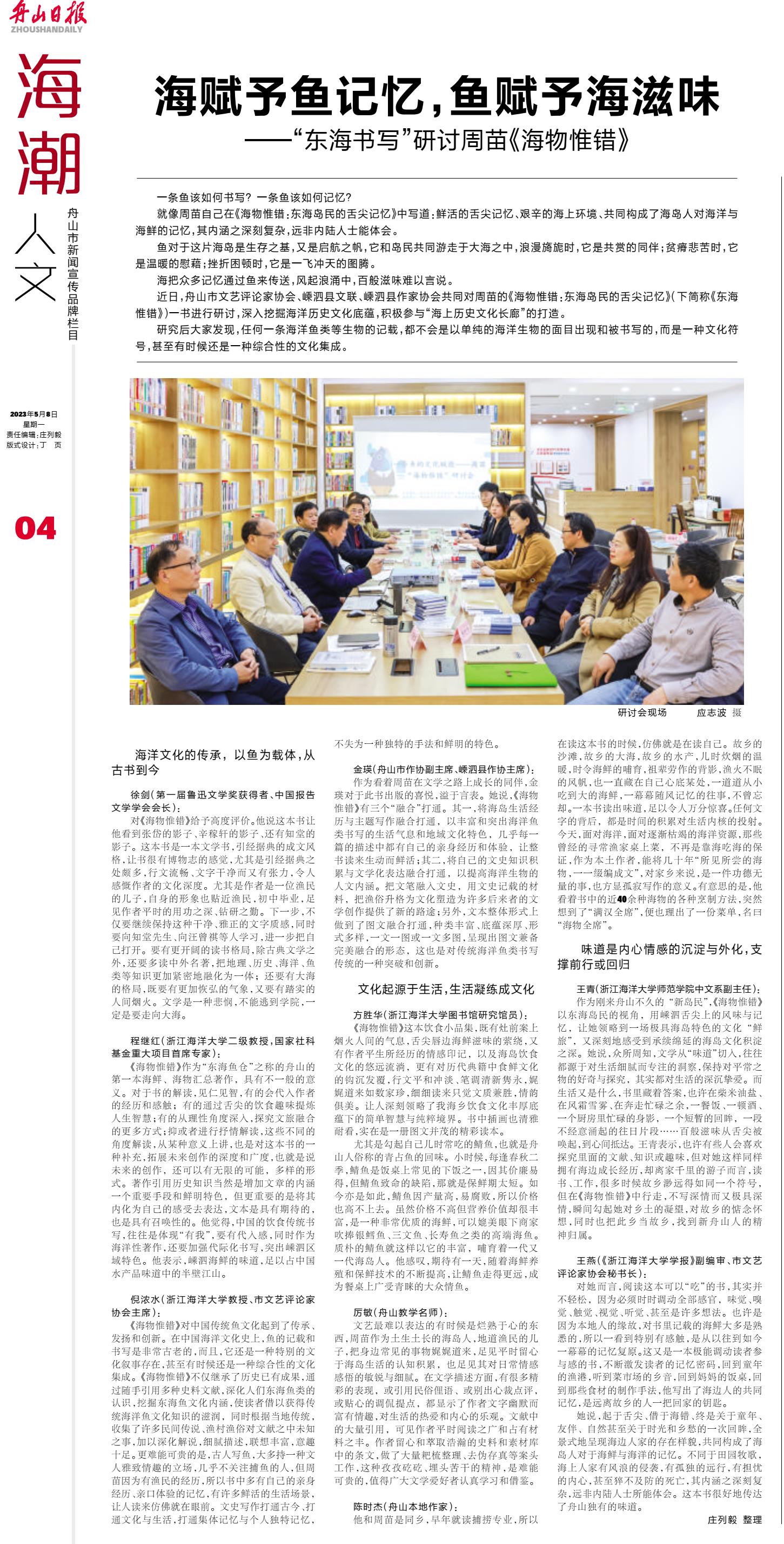 5月8日,《舟山日报》第04版以《海赋予鱼记忆,鱼赋予海滋味——“东海书写”研讨周苗<海物惟错>》为题,关注报道由舟山市文艺评论家协会、嵊泗县文联、嵊泗县作家协会共同举办的“周苗《海物惟错:东海岛民的舌尖记忆》研讨会”,我院教授、市文艺评论家协会主席倪浓水,我校二级教授、国家社科基金重大项目首席专家程继红,我院中文系副主任王青博士等参加此次研讨会,深入挖掘海洋历史文化底蕴,积极参与“海上历史文化长廊”的打造。