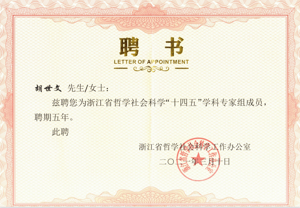 近日,浙江省社会科学发展规划领导小组公布浙江省哲学社会科学“十四五”学科专家组成员名单。我院胡世文教授被聘为浙江哲学社会科学“十四五”学科专家组成员,聘期五年。