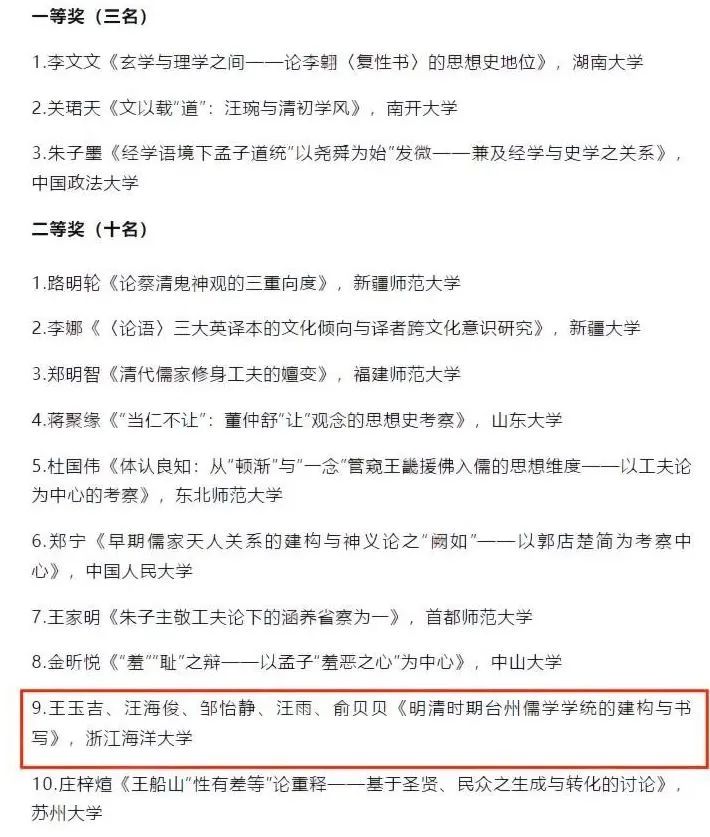 据悉,“桐江书院杯”儒学文化征文比赛是由浙江大学哲学学院、浙江大学中国思想文化研究所与中华读书报社联合主办的全国性大学生主题征文活动,目的是为了以桐江书院为中心,大力推广台州儒学,丰富中国儒学内涵。此次征文活动由主办方组织了具有权威性的评审委员会,共收到百余所高校学子的精彩投稿208篇,经整理后186份稿件进入初审。投稿作者不仅有本科生,还有很多硕士生和博士生。经评审委员会严格评选,评出一等奖3名,二等奖10名,三等奖20名,优秀奖30名。
