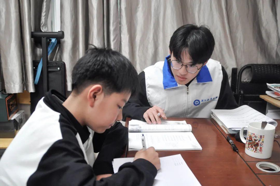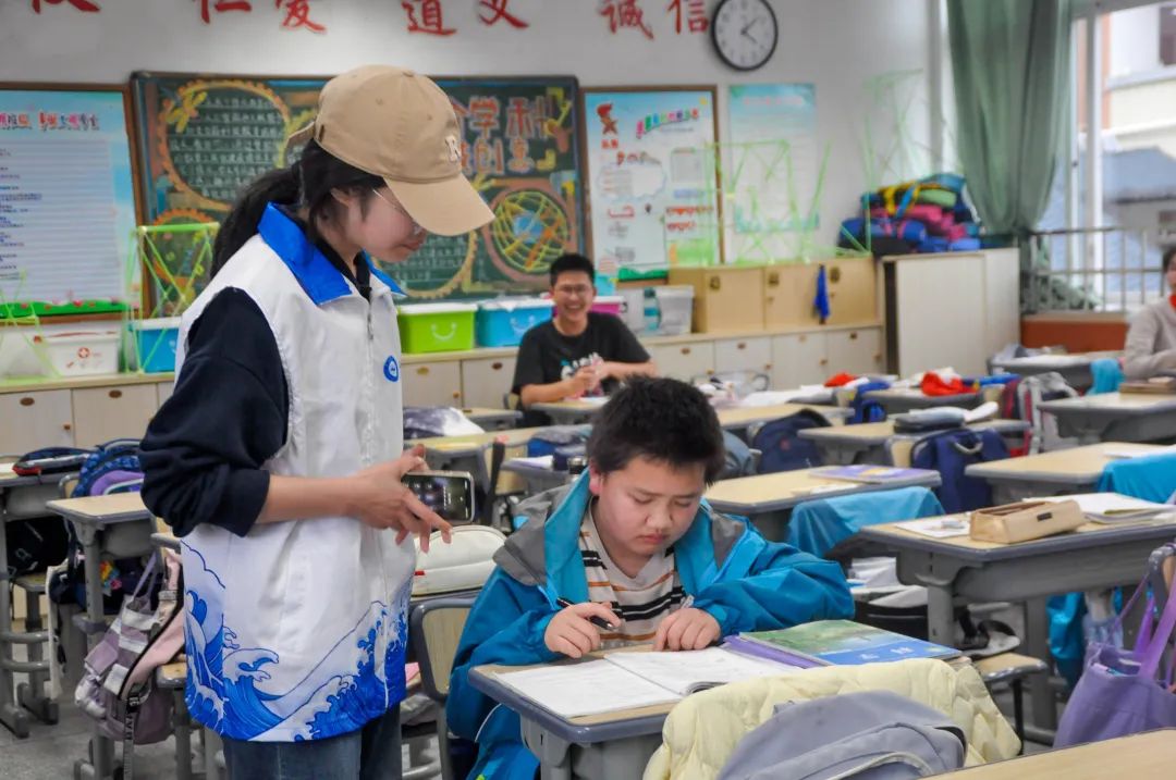 志愿者们来到各自负责的班级,与坐班老师对接后,按照相应的要求,辅助各科老师检查作业、批改作业。他们对四五年级班级里基础薄弱的同学进行一对一辅导。由于六年级同学的心智更加成熟,所以更侧重整个班级的管理。其中,在六(五)班,语文老师点评了班级同学的作文,并邀请了一位同学朗读他的优秀作文《我的眼泪》,他洪亮的声音、细腻的文笔得到了同学们和志愿者发自内心的掌声。在六(四)班的数学辅导中,同学们都积极地举手回答问题,当遇到不会的题目时,他们便虚心地问志愿者,志愿者们也热心地为他们解答。经过了一个多小时的活动,志愿者纷纷完成了各自的任务。