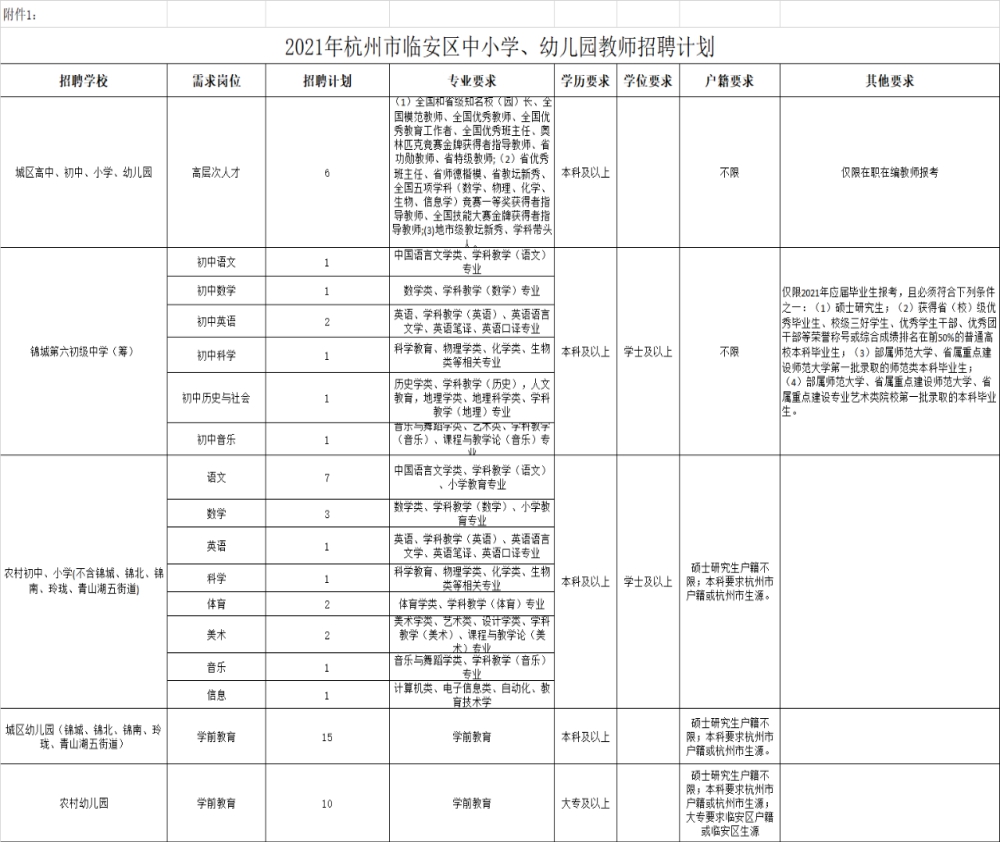 1.2021年杭州市临安区中小学、幼儿园教师招聘计划表;