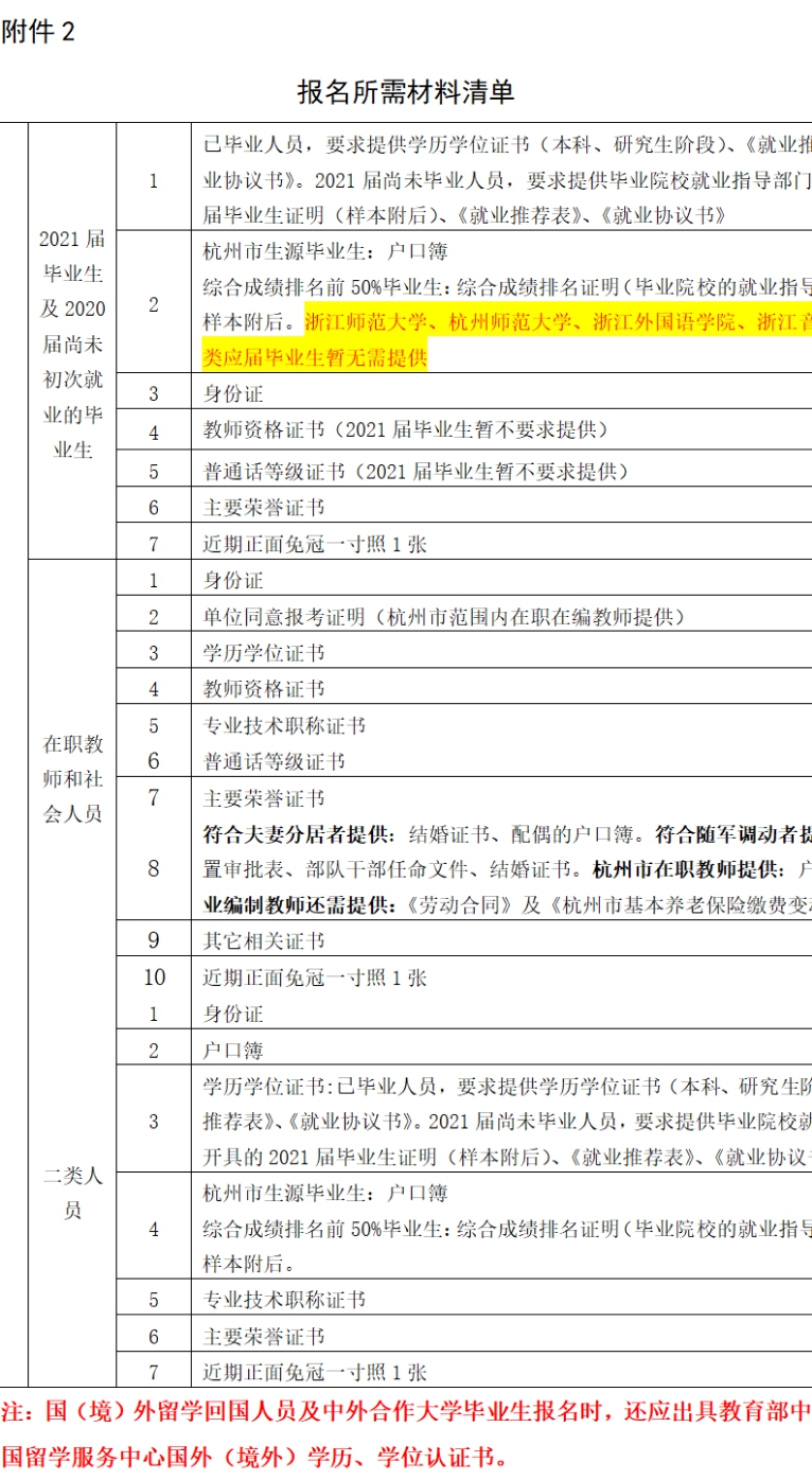 2.应届毕业生:列入国家统一招生计划(不含委培生、定向生)并且毕业时能如期取得相应学历、学位证书的普通高等院校、普通高等职业技术院校的2021届毕业生及2020届尚未初次就业的毕业生。必须符合下列情形之一:(1)毕业研究生;(2)普通高校综合成绩排名前50%的本科毕业生;(3)浙江师范大学、杭州师范大学、浙江外国语学院、浙江音乐学院具有留杭资格的毕业生;(4)杭州市生源毕业生;(5)普通高校学前教育专业本科毕业生;(6)普通高校特殊教育专业本科毕业生。另,2019年5月1日至2021年4月30日期间取得国(境)外学位并完成教育部学历、学位认证,具有杭州市户籍或硕士及以上学位的留学回国人员,未落实工作的,可按应届毕业生报考。