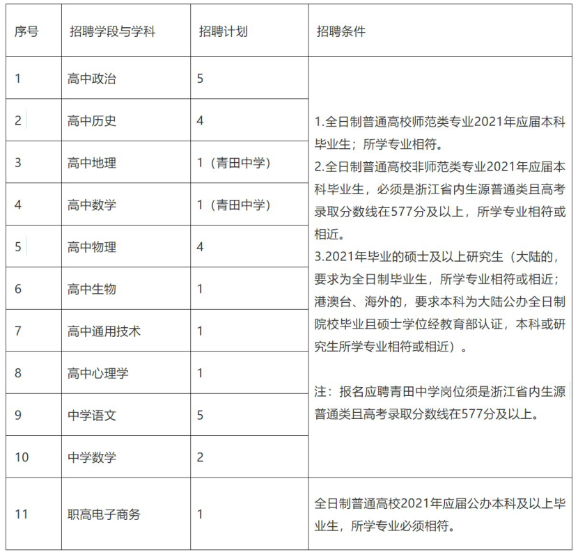 具体招聘的岗位、计划及招聘条件等,详见《青田县教育局赴浙江师范大学招聘中小学教师计划表》(见附件1)。