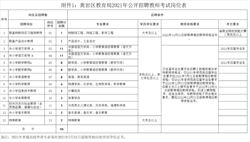 名条件详见《黄岩区教育局2021年公开招聘教师考试岗位表》(附件1),每位应聘人员限报一个岗位,如报多个岗位则视为报名无效。
