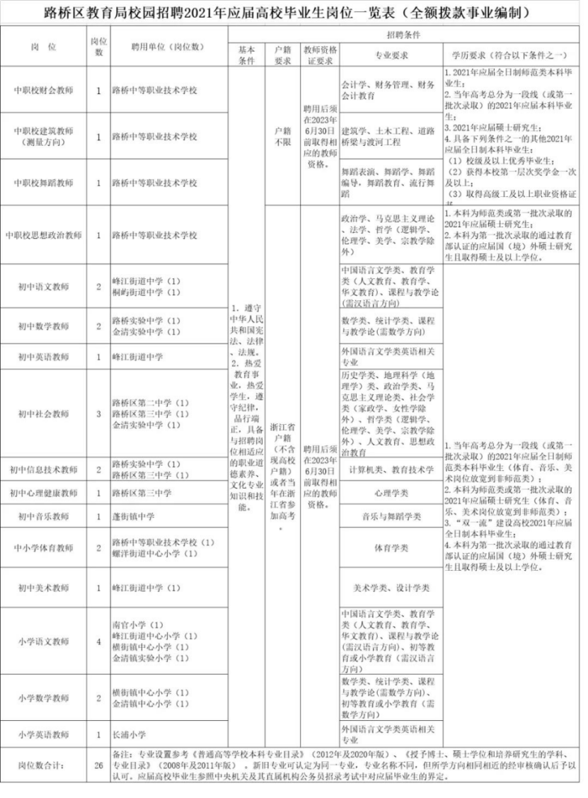提前批!台州路桥区招聘26名编制教师
