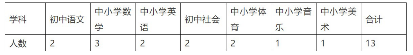 专业要求,初中语文:中国语言文学类;中小学数学:数学类、小学教育(数学方向,仅限小学数学岗位);中小学英语:英语类;初中社会:社会学类、政治学类、历史学类、法学类、哲学类、地理科学类、人文教育;中小学体育:体育学类;中小学音乐:音乐相关专业;中小学美术:美术相关专业。