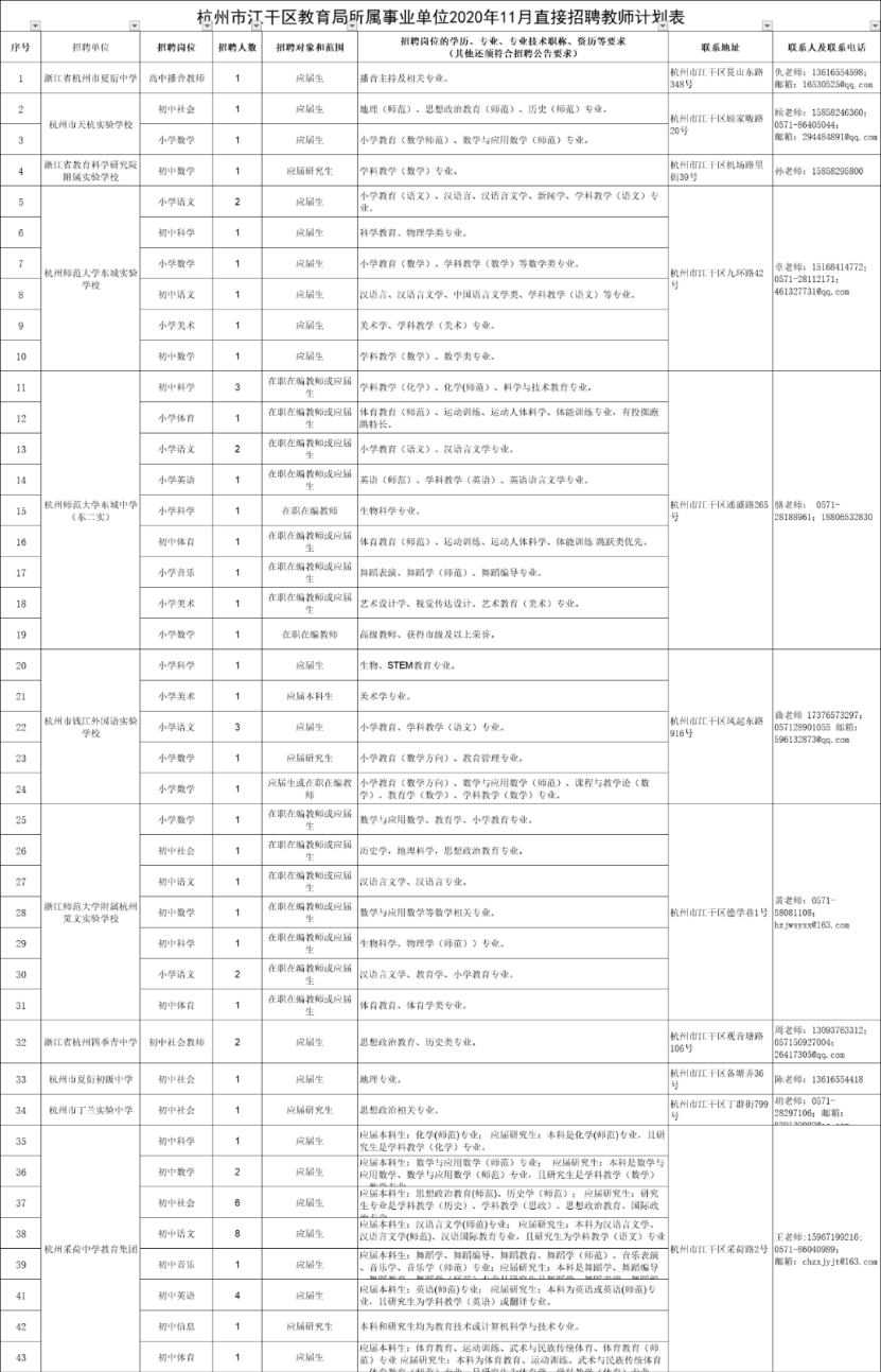 本次45家招聘单位均为财政补助事业单位,招聘录用的人员列入财政补助事业编制管理。各招聘单位、岗位、人数、条件等详细情况详见《杭州市江干区教育局所属事业单位2020年11月公开招聘专任教师计划表》(附件1,以下简称《招聘计划表》)。