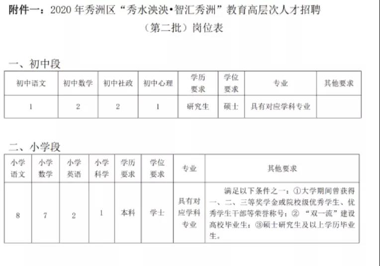 附件一:2020年秀洲区“秀水泱泱•智汇秀洲”教育高层次人才招聘(第二批)岗位表(见图片)