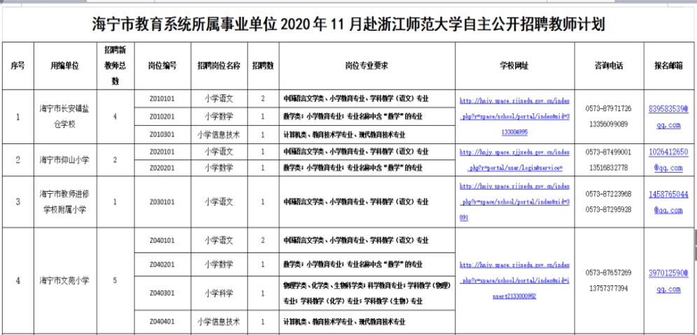 招聘岗位:详见《海宁市教育系统所属事业单位2020年11月赴浙江师范大学自主公开招聘教师计划》(附件1,以下简称《计划》)。