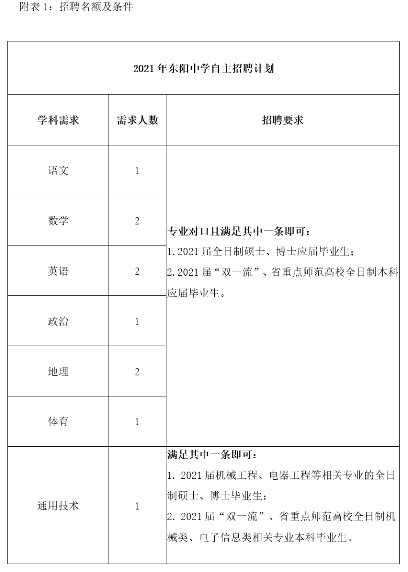 二、招聘条件及名额:东阳中学10名、东阳市外国语学校4名具体名额及条件详见附表1。