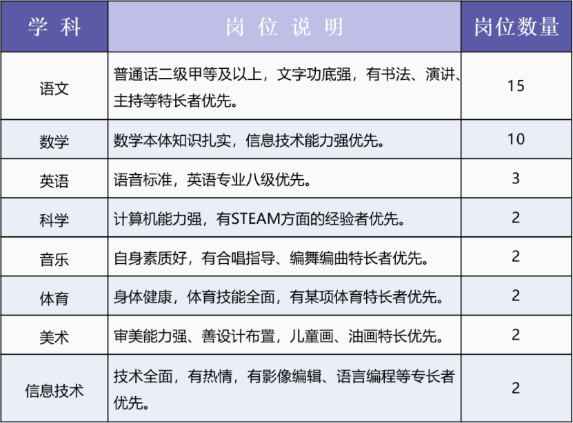 小学语文、数学、英语、科学、音乐、体育、美术、信息技术教师若干名。
