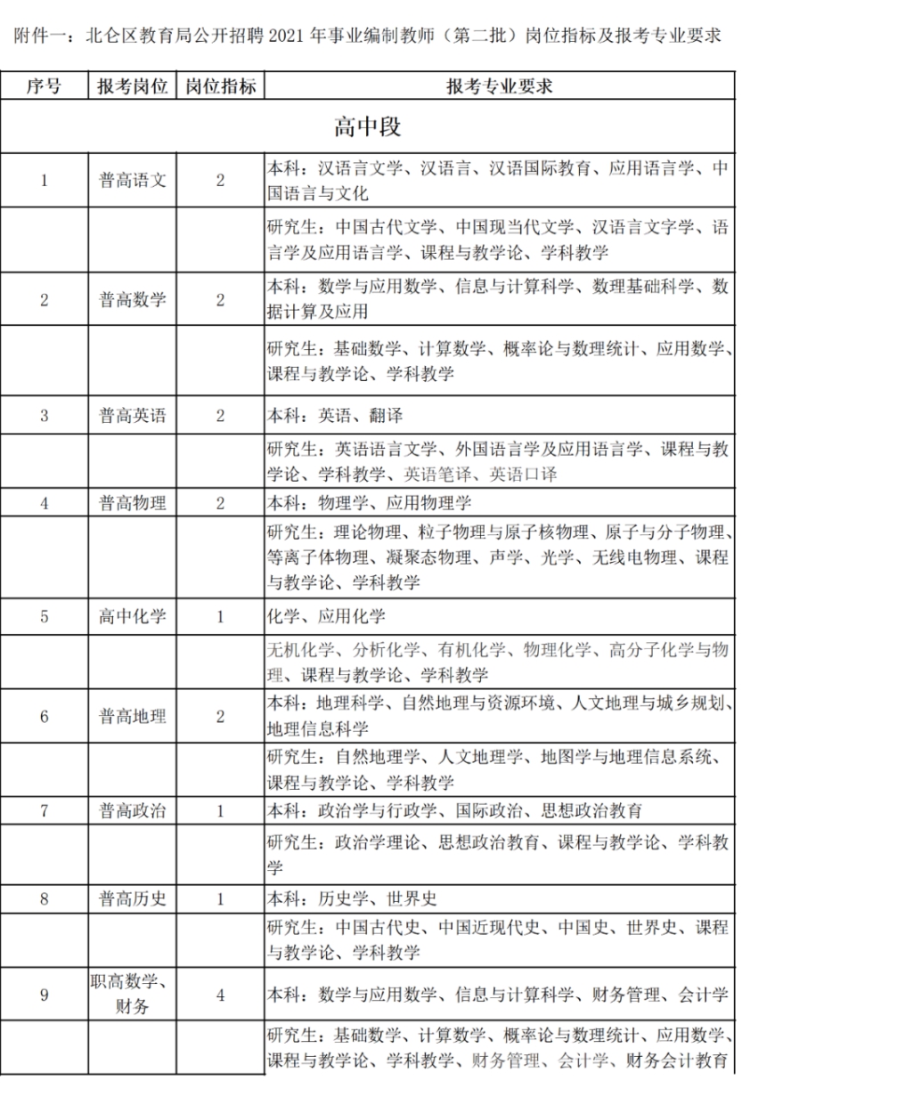 具体招聘岗位、指标及专业要求等详见《北仑区教育局公开招聘2021年事业编制教师(第二批)岗位指标及报考专业要求》(见附件一)。