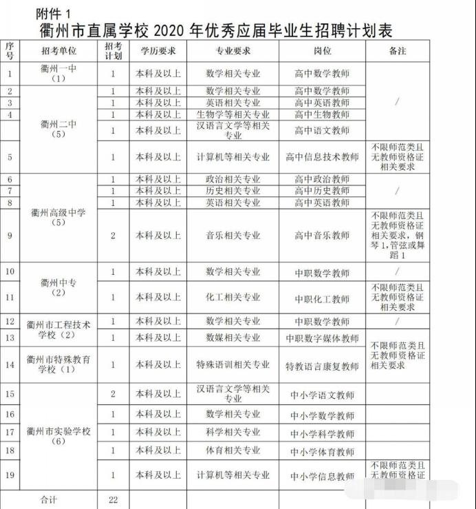 根据衢州市直属学校办学需求,拟招聘2020年全日制优秀应届毕业生共22人(具体计划详见附件1)。