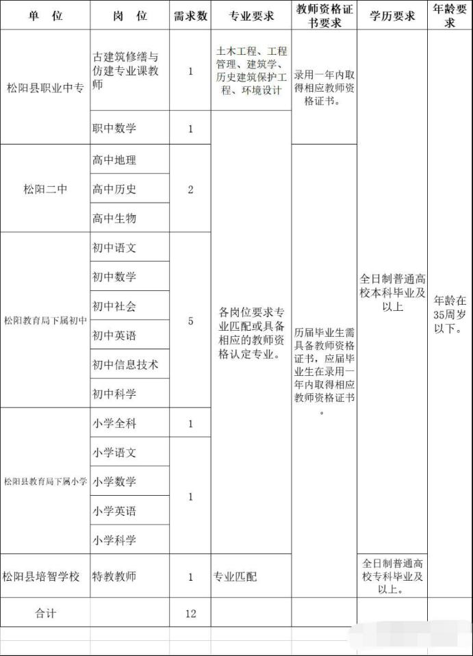 5、松阳县职业中专专业课教师要求全日制本科毕业,且有三年(含三年)以上相关专业工作经历,报名时自备工作经历证明材料(提供缴纳社保证明、工资证明)。