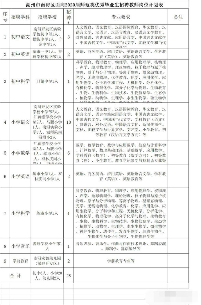 (3)所学专业与报考岗位必须相符,具体见《湖州市南浔区面向2020届师范类优秀毕业生招聘教师岗位计划表》(附件1)。