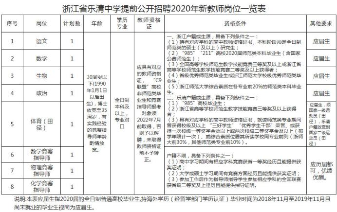 ★(四)各岗位的学历、专业、年龄等具体条件要求详见下方《浙江省乐清中学提前公开招聘2020年新教师岗位一览表》。