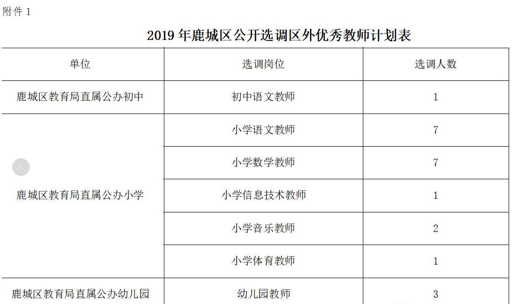 详见《2019年鹿城区公开选调区外优秀教师计划表》(附件1)。
