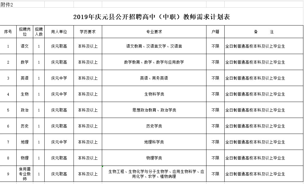 本次计划公开招聘公办高中(中职)教师9名。具体的招聘岗位、人数和报考条件见《2019年庆元县公开招聘高中(中职)教师需求计划表》(附件2)
