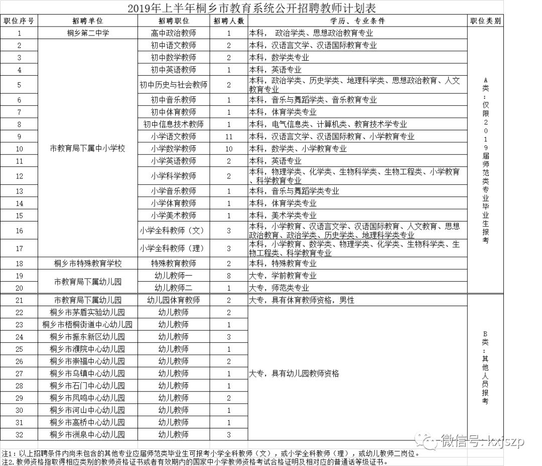 A类岗位:桐乡市生源或桐乡市户籍的2019年全日制普通高校应届师范类毕业生;