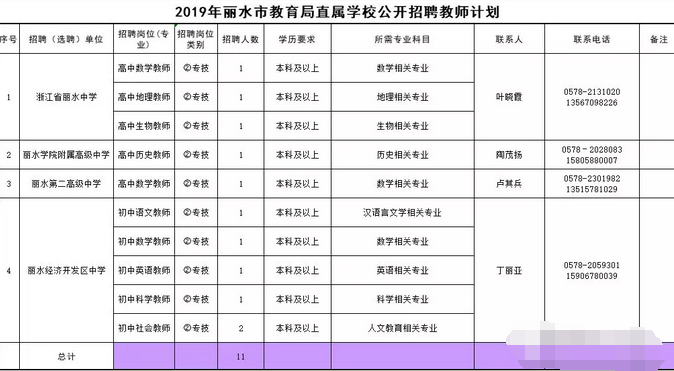 本次丽水市教育局4所直属学校公开招聘教师共11名,具体岗位(专业)、人数和报考资格条件详见附件《2019年丽水市教育局直属学校公开招聘教师计划》。