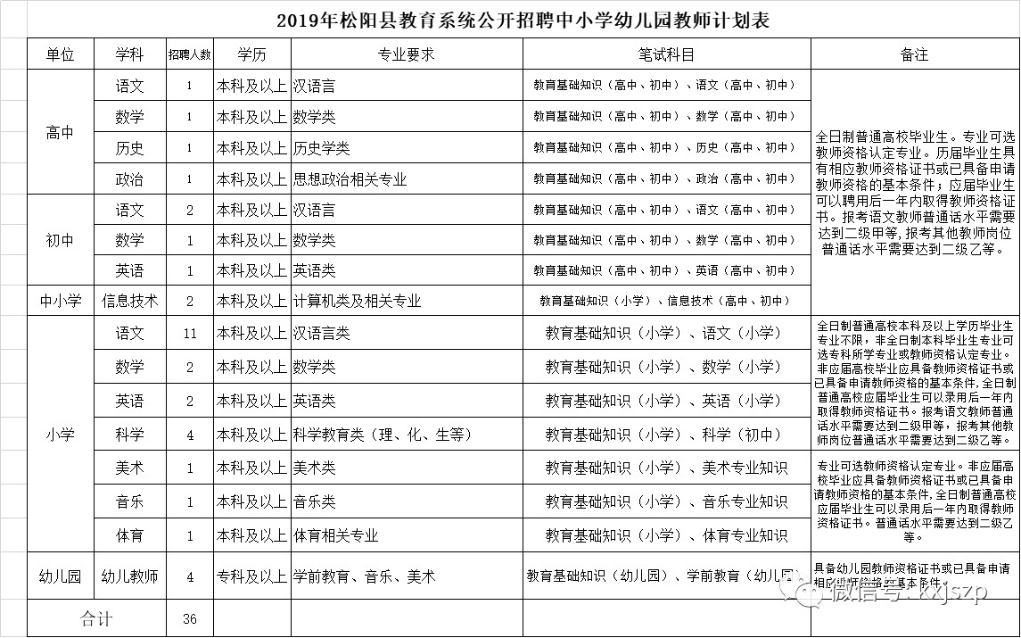 本次公开招聘中小学幼儿园教师36名。具体的招聘层次、岗位(专业)、人数和报考资格条件见附件《2019年松阳县教育系统公开招聘中小学幼儿园教师计划表》。
