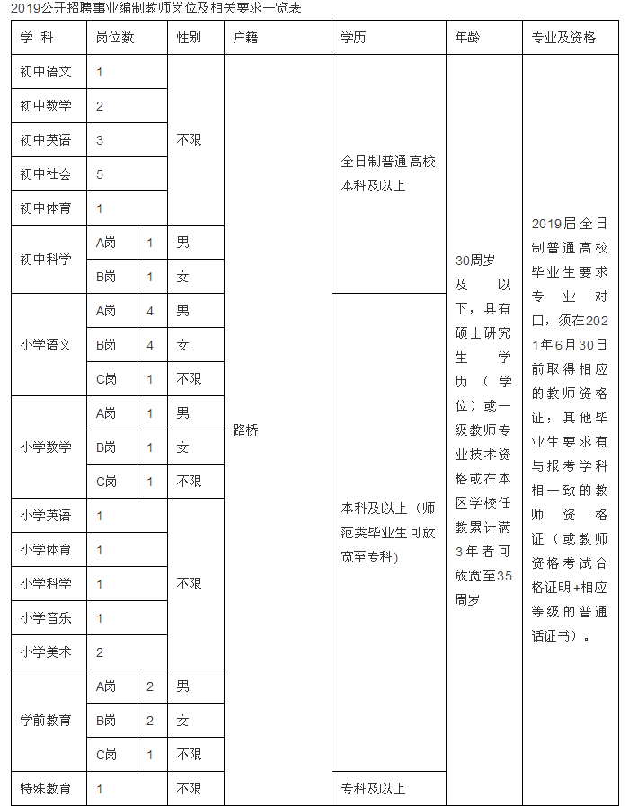 为推进教育系统人事制度改革,优化教师队伍结构,促进教育优质均衡发展,根据国家、省、市事业单位公开招聘工作人员有关规定,结合路桥实际,经研究,决定公开招聘事业编制教师。现将有关事项通告如下: