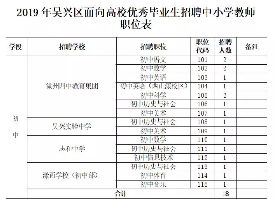 2019年吴兴区面向高校优秀毕业生招聘中小学教师124名,其中,初中教师18名,小学教师106名。