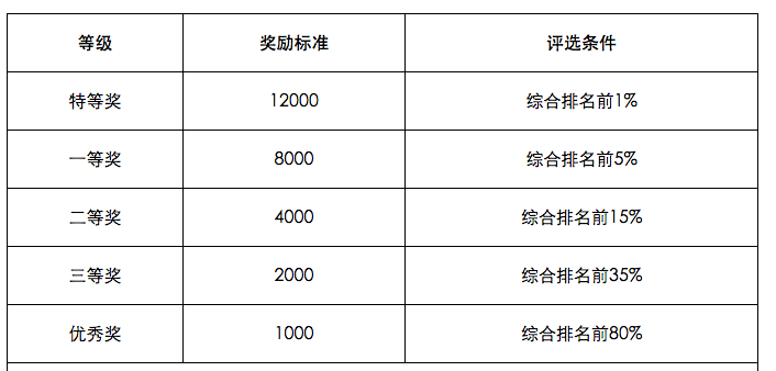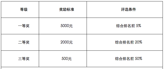 2.奖励等级根据考生入学考试成绩综合排名确定。考生综合排名根据入学考试初试总成绩排名与外语单科成绩排名之和,按从小到大排序确定,并参照下表进行奖学金评选: