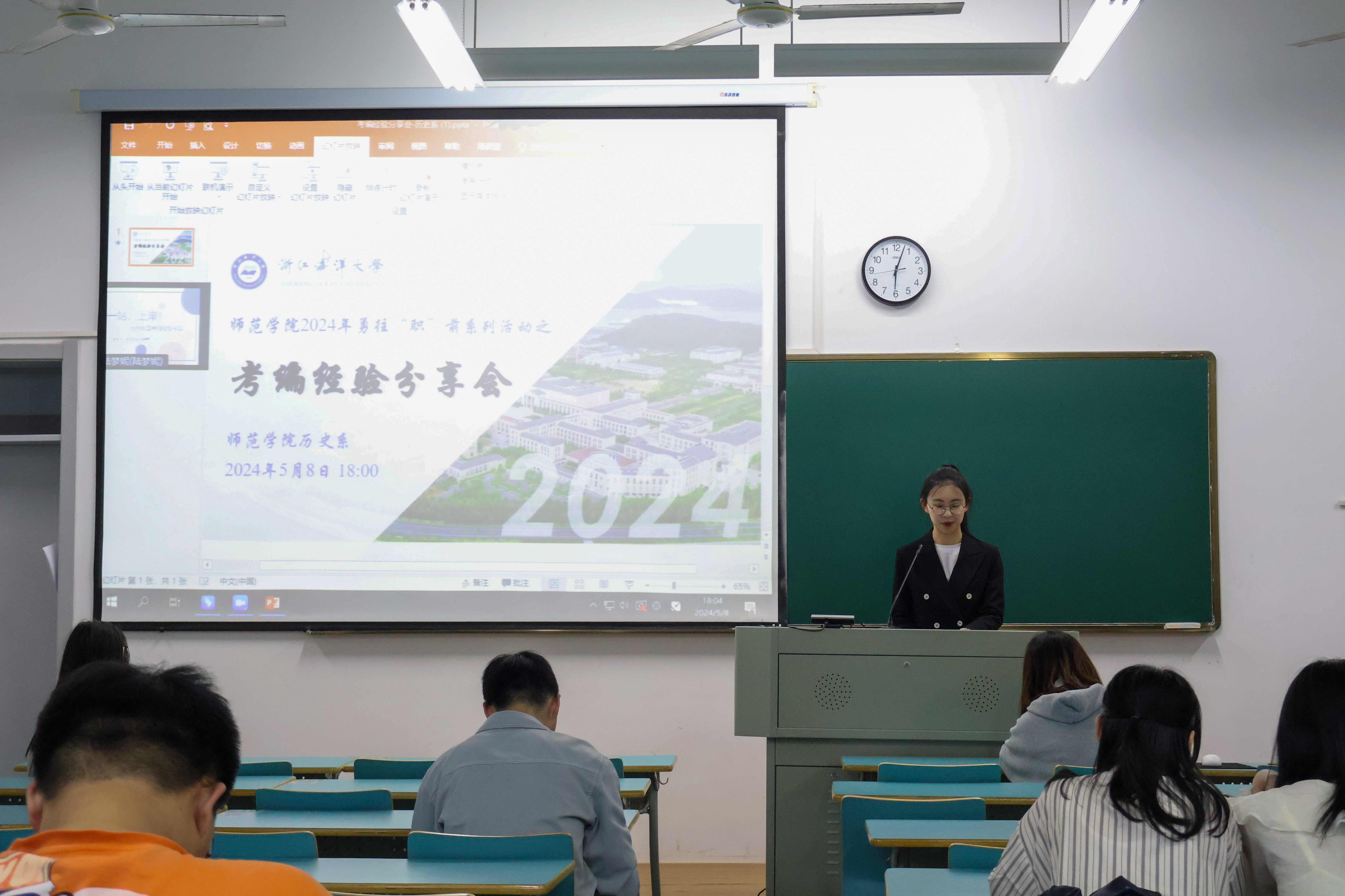 为激发历史系学子考编热情,帮助同学们学习考编经验,优化考编规划。2024年5月8日晚,yl9193永利集团历史学(师范)专业考编经验分享会在新城校区新教学楼B102举行,定海校区教学楼134同步进行直播观看。本次分享会由柴宇泽同学主持,特邀B20历史张菁菁(上岸杭州市萧山区教育局)、B20历史李思(上岸湖州市志和中学)、B20历史徐佳妤(上岸宁波市镇海中学)、B20历史吴佳欣(上岸浙江省台州市玉环市教育局)、B20历史刘慧星(上岸舟山市定海区教育局下属学校)担任分享会主讲。