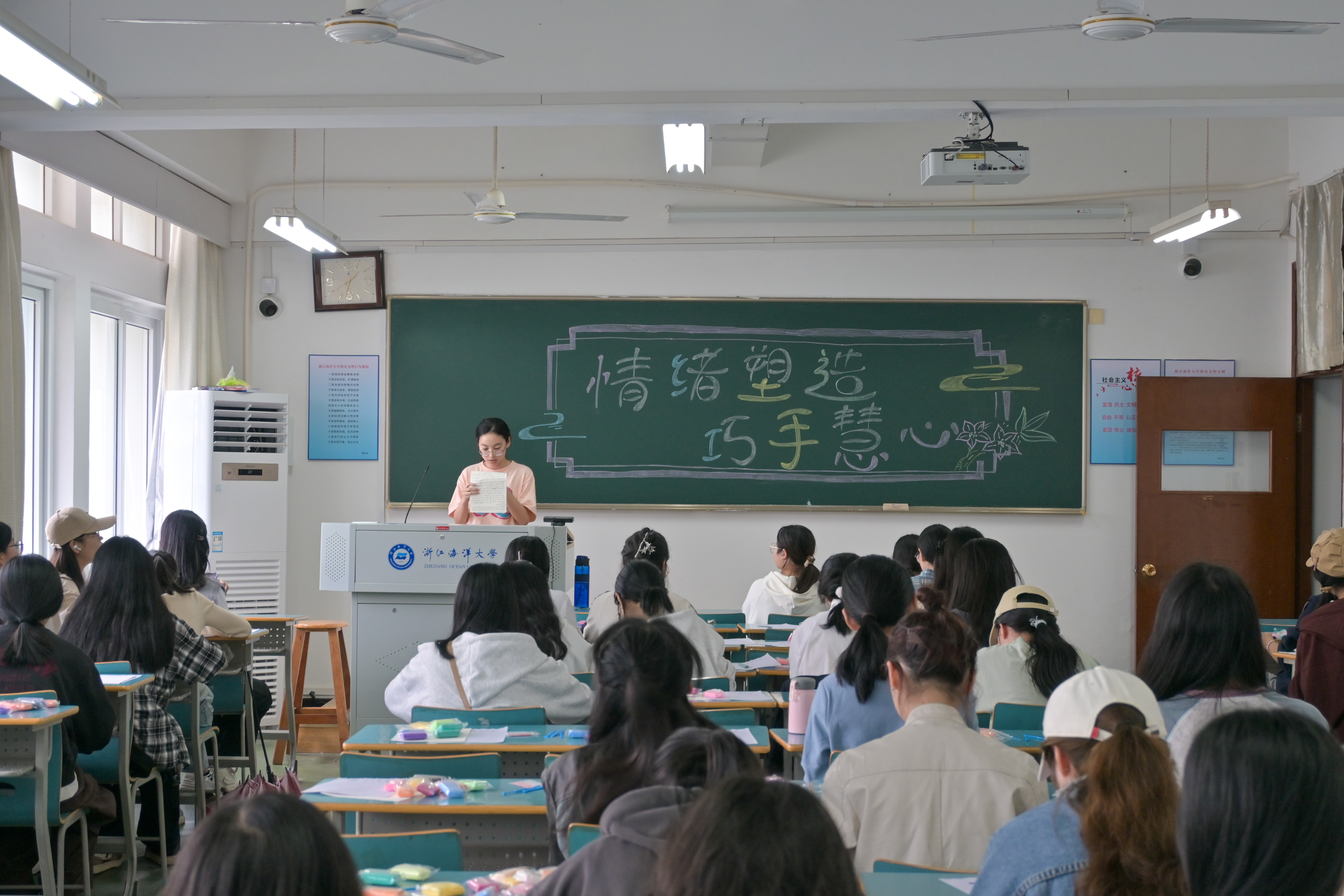 活动前,工作人员充分做好准备工作,有序发放粘土和海大纸等活动材料。活动开始后,主持人郑曼佳和陈鑫缘简单地介绍了本次活动的目的和流程。她们提到,这次的活动是为了让同学们忘却外界喧嚣,发挥丰富的想象力,沉浸在创造世界,用粘土来塑造积极情绪,摆脱烦恼忧虑,重拾心中的宁静与力量!