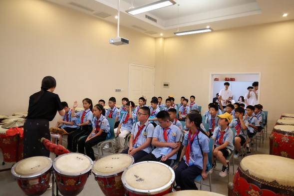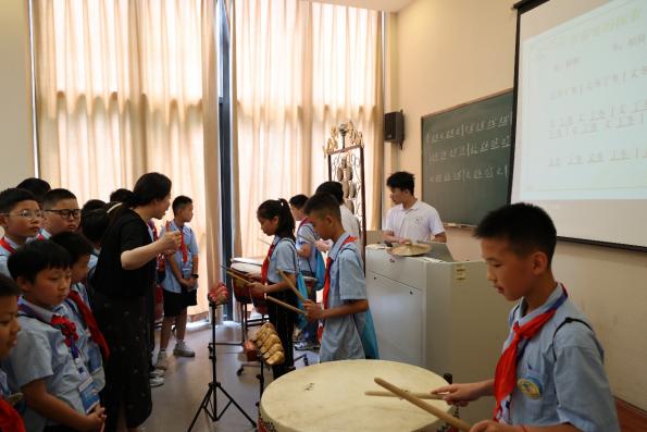 在理论讲解之后,同学们进行舟山锣鼓实践体验。费老师亲自示范,指导同学们尝试敲击不同的锣鼓乐器,感受节奏与韵律的变化。同学们热情高涨,纷纷上前尝试,在实践中体会演奏的技巧,感受非遗艺术的趣味性。通过实践,同学们不仅加深了对舟山锣鼓的理解,更在动手操作中培养了艺术感知力和团队协作能力。